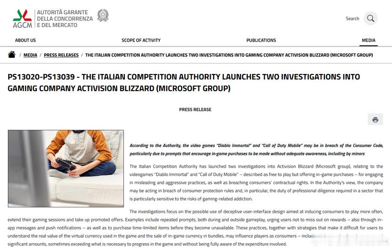 【意大利调查动视暴雪:腾讯《COD M》网易《暗黑不朽》躺枪!网页链接】近日,欧洲游戏市场再掀监管风暴。意大利竞争管理局(AGCM)正式宣布对美国游戏巨头动视暴雪启动两项独立调查,矛头直指其旗下的两款王牌手游《暗黑破坏神:不朽》与《使命召唤手游》,而这两款游戏都是动视暴雪授权由中国公司开发的,其在西方的发行商都是动视暴雪自己。