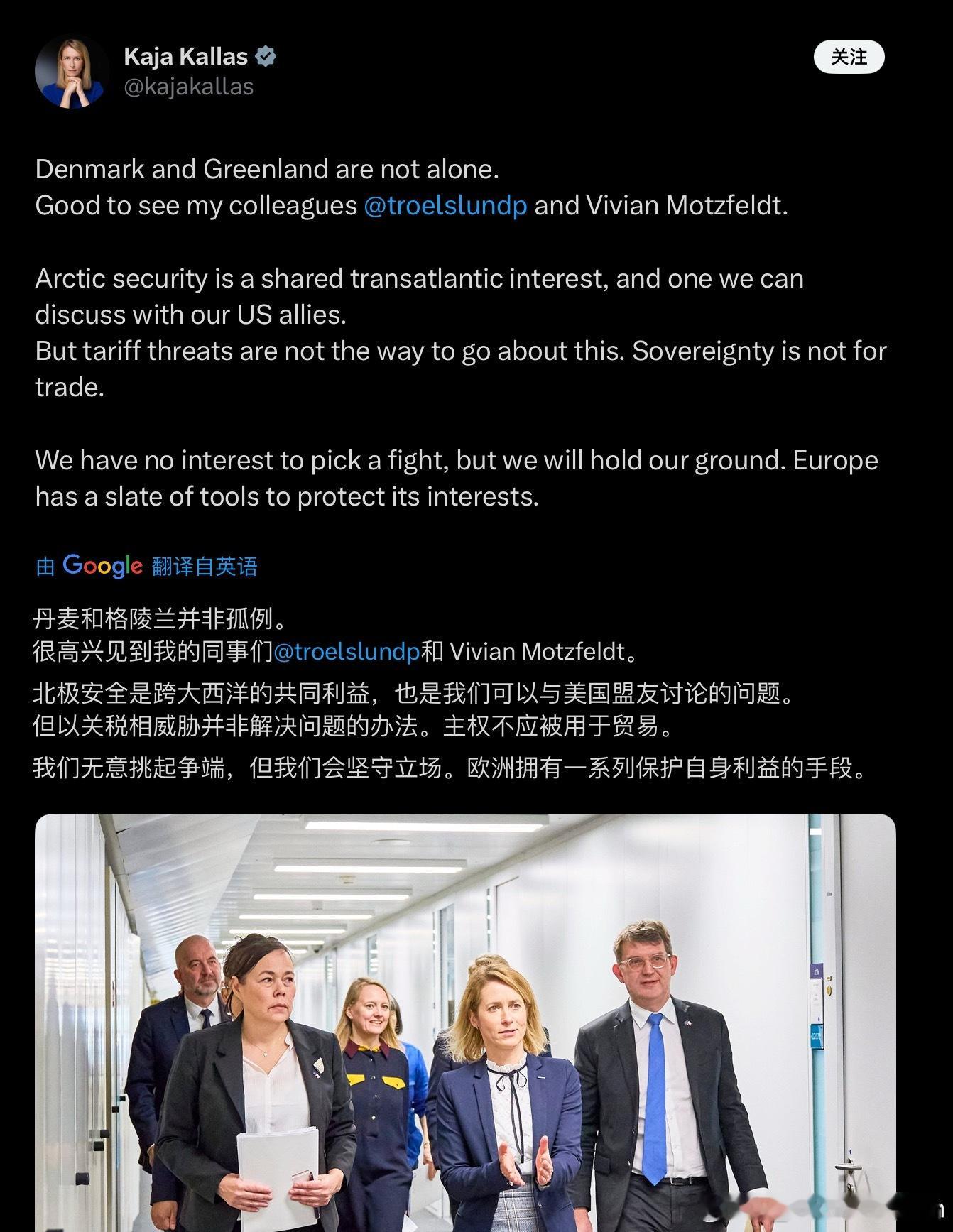 代表欧盟颜面与外交政策卡拉斯女士:美国是我们的盟友,格陵兰岛的问题不是不可以谈嘛。🤡🤡🤡我以为我英语学差了还专门去查了“盟友”这个词的含义,这词肯定不是形容“威胁入侵你领土的国家”的呀,而且一个国家的主权问题是让你随意和想要入侵你的国家商议的吗?卡拉斯但凡能拿出十分之一她对华的强硬态度对美国,我都敬她是个言行合一的人。欧盟顶级外交官,自己的成员国主权受损她表示“可以谈”,但对非成员国的乌克兰领土却寸步不让,这是什么舍己为人的精神