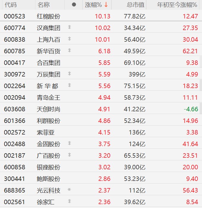 格隆汇1月20日|A股市场新零售股走强,其中,红棉股份、汉商集团、上海九百涨停,新华百货涨超6%,合百集团、万辰集团、新华都涨超5%,青岛金王、天创时尚、利群股份、索菲亚涨超4%,金固股份、广百股份、银座股份涨超3%。