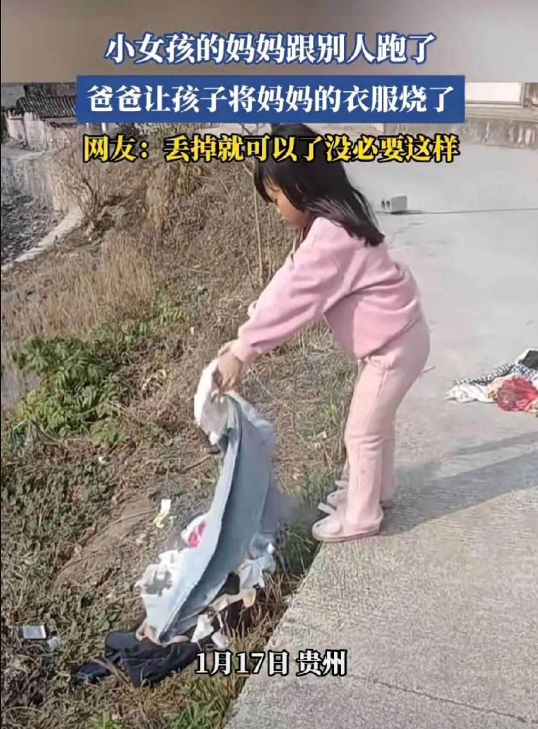 遇到这种奇葩事,小女孩估计也挺无语的! 近日贵州一男子因自己的老婆跟别人跑了,于是就叫自己六七岁的女儿把老婆所有的衣服,一件不剩的都拿出来在自家门口烧了。 好多网友也是纷纷不解,大人的事何苦要为难孩子,自己烧了不就行了吗! 好多有同样经历说:这样才解恨,就是要女儿知道她妈妈的为人。 非得让孩子跟自己一样恨才是唯一的出路吗?怎么能做出这么绝情的事情。 孩子还小,再怎么着也是妈妈怀胎十月冒着生命危险生的,就不能保护一颗幼小的心灵吗?她的同学身边人该如何看待她,个人觉得这位爸爸有点自私了。再怎么着不能把痛苦强加到孩子身上。 不过话说回来,咱们都不是当事人,可能也理解不了到底这个孩子的妈妈有多绝情,才让这男的做出这种事来!