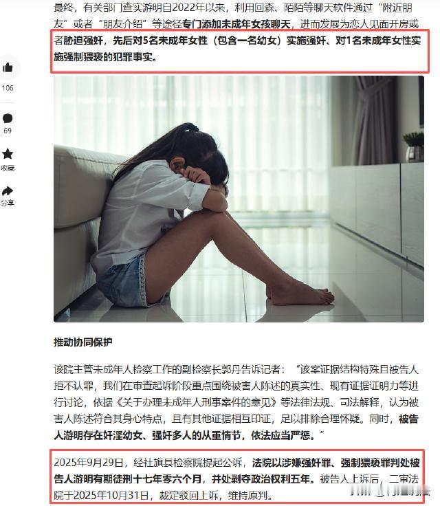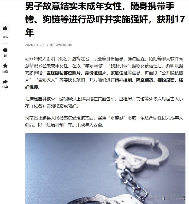 河南社旗,男子游明虚构身份,用一些软件结识未成年女性。先“嘘寒问暖”“用钱引诱”骗取信任,接着哄骗或胁迫女孩发隐私信息,还以公开隐私要挟进行精神控制,多次在面包车、出租屋、宾馆等地对她们实施猥亵。最终法院的判决让人大快人心! 深圳新闻网于2026年1月20日07:30分报道了此事。 据报道,游明(化名)为了达到自己的目的,竟然虚构身份信息。然后把目光盯上了某些社交软件,专门在上面寻找未成年女性下手。 游明一开始装得可好了,对那些未成年女孩“嘘寒问暖”,就像个贴心的大哥哥。他还时不时地用钱财去引诱这些涉世未深的女孩,让她们觉得自己遇到了好人,慢慢就放松了警惕。 等女孩们信任他之后,游明就露出了丑恶的嘴脸。他开始哄骗女孩们发自己的隐私信息,要是女孩们不愿意,他就用公开隐私来威胁她们。 女孩们年纪小,哪里经得住这样的吓唬,只能乖乖听话。就这样,游明对女孩们进行了精神控制,让她们不敢反抗。 小花(化名)就是其中一个受害者,游明不仅隔空对小花进行猥亵,还约小花见面。见面之后,他更是丧心病狂地强迫小花发生了关系。 而且,他还不止在一个地方作案,面包车、出租屋、宾馆都成了他犯罪的场所。小花一次次地遭受他的侵犯,身心都受到了极大的伤害。 大家说,遇到这种事,女孩们该有多绝望? 民警介入调查后,发现游明的罪行远不止这些。 从2022年起,他先后对5名未成年女性(其中还有一名幼女)实施了强 奸,对1名未成年女性进行了强制猥亵。 他的这些行为,让人听着就让人触目惊心,游明的行为简直令人发指。 从受害者家属的角度看,肯定是愤怒、心疼,自己的孩子遭遇了这样的不幸,换做谁都无法接受,肯定希望法律能严惩游明,给孩子一个公道。 游明虚构身份,对多名未成年女性实施 强 奸 和强制猥亵,从法律角度该怎么看呢? 这个案子的证据比较特殊,游明还拒不认罪。 在审查起诉时,围绕被害人陈述的真实性展开了讨论。 毕竟这些未成年女孩年纪小,会不会因为害怕或者其他原因,陈述的内容不准确呢? 而且游明不认罪,也给案件的审理带来了困难。 那么,法律上该怎么解决这些问题呢? 根据相关法律规定,对于被害人陈述的真实性,不能仅仅因为被告人不认罪就轻易否定。 虽然游明不认罪,但是被害人陈述可信,并且还有其他证据可以印证。 在调查过程中收集到的物证、证人证言等,都能和被害人的陈述相互佐证。 从《刑法》来看,游明的行为,构成了强奸罪和强制猥亵罪。 根据刑法第二百三十六条规定,以暴力、胁迫或者其他手段 强 奸 妇女的,处三年以上十年以下有期徒刑。奸 淫 不满十四周岁的幼女的,以 强 奸 论,从重处罚。强 奸 妇女、奸 淫 幼 女 多人的,处十年以上有期徒刑、无期徒刑或者死刑。 游明不仅 奸 淫 了幼女,还强 奸 了多人,属于从重处罚的情节。 再根据刑法第二百三十七条规定,以暴力、胁迫或者其他方法强制 猥 亵 他人或者 侮 辱 妇女的,处五年以下有期徒刑或者拘役。 游明对未成年女性进行强制 猥 亵,也违反了这一规定。 2025年9月29日,法院进行了一审判决,10月31日二审维持原判,判处游明有期徒刑十七年零六个月,剥夺政治权利五年。 大家觉得在处理这类案件时,如何更好地保护未成年被害人的权益呢? 您对这件事有什么看法呢?