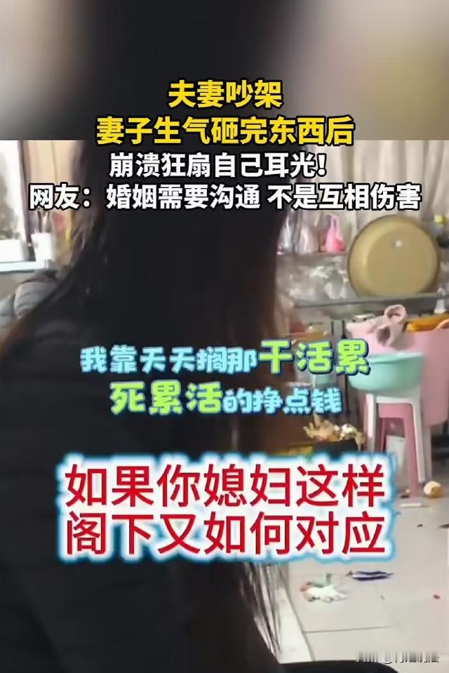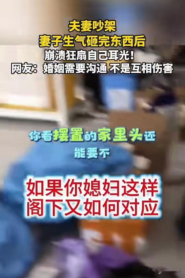 夫妻俩吵架,妻子突然情绪崩溃,将家里砸了个稀巴烂,丈夫等她发泄完,问她到底想怎么样,妻子却再次崩溃,左右开弓疯狂扇自己耳光。丈夫无奈:如果你媳妇这样,阁下又如何应对? 观象新闻发布的这条视频中,妻子坐在床边上一言不发,丈夫站在旁边,一边不停数落妻子一边拍视频, 根据丈夫的话得知,造成这一切的只是夫妻间的一些小争吵。 原来,丈夫每天在外面上班,妻子却经常对生活不满意,觉得丈夫钱没给到位,陪伴也没给到位,夫妻两个经常吵架。 丈夫只是个普通人,挣不来那么多的钱,但是不干活,一家人连生活都维持不下去,正如网友们所说:我要抱你就没有能力养你,我要养你就没有时间抱你。 丈夫每天为了生计奔波,妻子每天操持着家里,可家庭并没有越来越好,他们陷入死循环,妻子对丈夫的埋怨也越来越多。 于是这次吵架后,妻子内心的委屈爆发了,她将家里砸了个稀巴烂,可是砸完后,看着自己精心维护的小家变成这样,妻子又后悔了。 丈夫看着她发完疯,拿出手机拍摄,一边拍一边数落她:东西你也砸了,手机你也摔了,我你也打罢了,你就说你还想咋弄? 丈夫说:你要是能过咱就过,不能过你就说你想要啥?我天天干活累死累活的挣点钱,都砸了都摔了,再重新买?这活干的还有啥意思你说? 丈夫不停数落她:整天嫌我,说我这不行那不行,你行也管!整天两个人搁这自残,搁这打架,搁这生气有啥用?能解决问题不? 丈夫将镜头对准家里,家里到处都是家居物品碎片,一片狼藉:你看看家里摆置的,还能要不?非得砸了? 妻子终于说了第一句话:这不是你想要的吗? 丈夫将镜头再次对准妻子:这咋是因为我,我问你这是我说的吗? 妻子突然再次情绪崩溃,双手揪住自己的头发,带着哭腔说:你别拍我,你别拍我! 丈夫不吭声,继续对准妻子拍,妻子情绪越来越崩溃,开始抽自己耳光,哭着大声说:别拍我! 丈夫大声吼了一句:就拍你!妻子一边哭,一边疯狂抽自己耳光。 事后,丈夫将这段视频发出来,配文:如果你媳妇这样,阁下又如何应对? 视频发出来后,有人说,赶紧离婚,这种女人娶回家,真的会毁三代。 也有人说,事情没有这么简单,只一段掐头去尾的视频,根本说明不了什么,妻子能这样做,心里的委屈肯定也是憋了很久了。 如果丈夫真的为了妻子好,为了家好,妻子情绪崩溃砸家的时候,他就应该站出来阻止,而不是等妻子后悔了,在旁边拍视频数落。 也有人说,这就是婚姻中不沟通的后果,如果妻子能撒个娇,好好和丈夫表达自己的需求,或者丈夫在妻子崩溃的时候,不要说教,上去给她一个拥抱,就什么事都没有了。 说白了,这夫妻俩都没错,只是不能设身处地为对方想而已。 《民法典》第一千零五十九条规定,夫妻有相互扶养的义务。 视频中的丈夫为家庭生计奔波,妻子操持家中事务,双方都在以不同方式履行扶养家庭的责任。 但是,《民法典》第一千零四十三条还规定,家庭应当树立优良家风,弘扬家庭美德,重视家庭文明建设。夫妻应当互相忠实,互相尊重,互相关爱;家庭成员应当敬老爱幼,互相帮助,维护平等、和睦、文明的婚姻家庭关系。 维持家庭的和谐稳定,还需要夫妻间相互尊重,互相帮助,互相关爱。 视频中的丈夫和妻子,应当在精神上相互慰籍,在生活上互相帮助,丈夫不能因工作劳累而忽视对妻子精神层面的关怀,妻子也应理解丈夫的艰辛,共同维护家庭的和谐稳定。 夫妻之间产生矛盾后,也应遵循上述原则,避免言语和行为的过激,尊重对方感受。 此外,《民法典》第一千零六十二条明确了夫妻在婚姻关系存续期间所得财产属于共同财产。 妻子砸毁家中物品,是对共同财产的损害,如果这种行为造成重大财产损失,在涉及离婚财产分割时,根据第一千零九十二条,夫妻一方隐藏、转移、变卖、毁损、挥霍夫妻共同财产,在离婚分割夫妻共同财产时,对该方可以少分或者不分。 所以,即便在情绪激动时,双方也应保持理智,避免损害共同财产。 婚姻关系就像一面镜子,越是有矛盾越是要好好解决,万一夫妻间的信任和感情被打碎了,破镜可就难圆了!