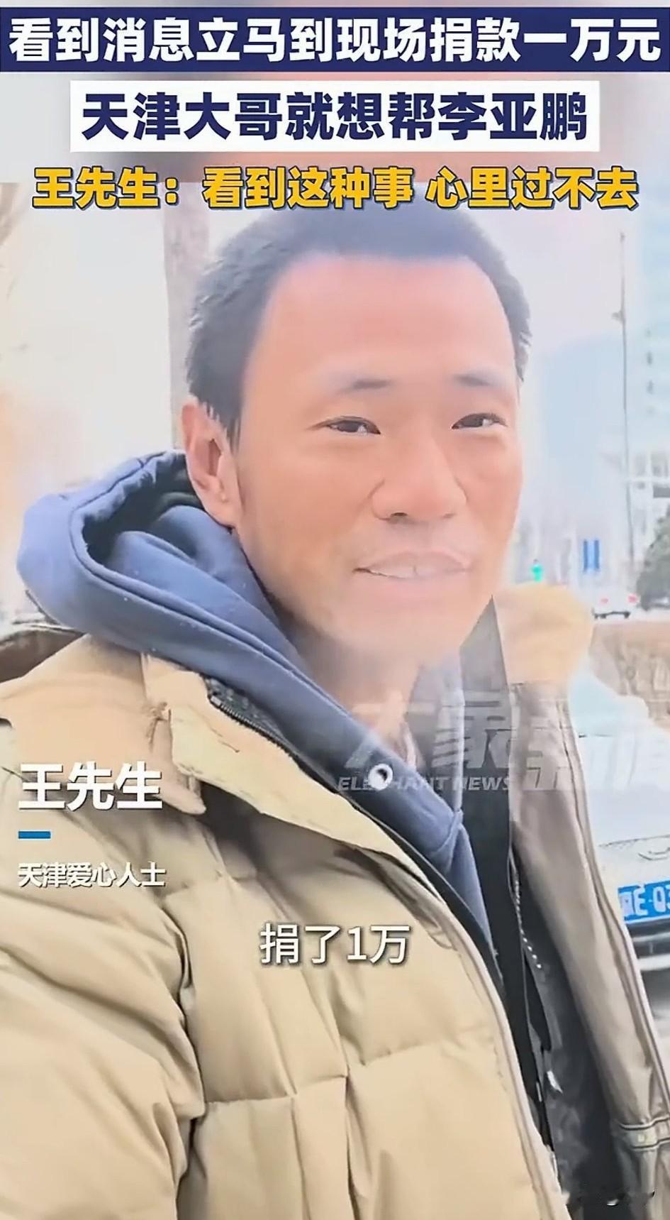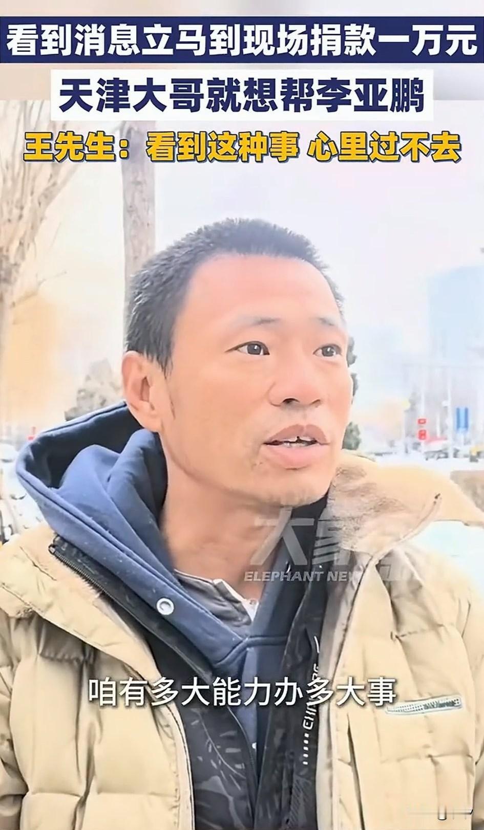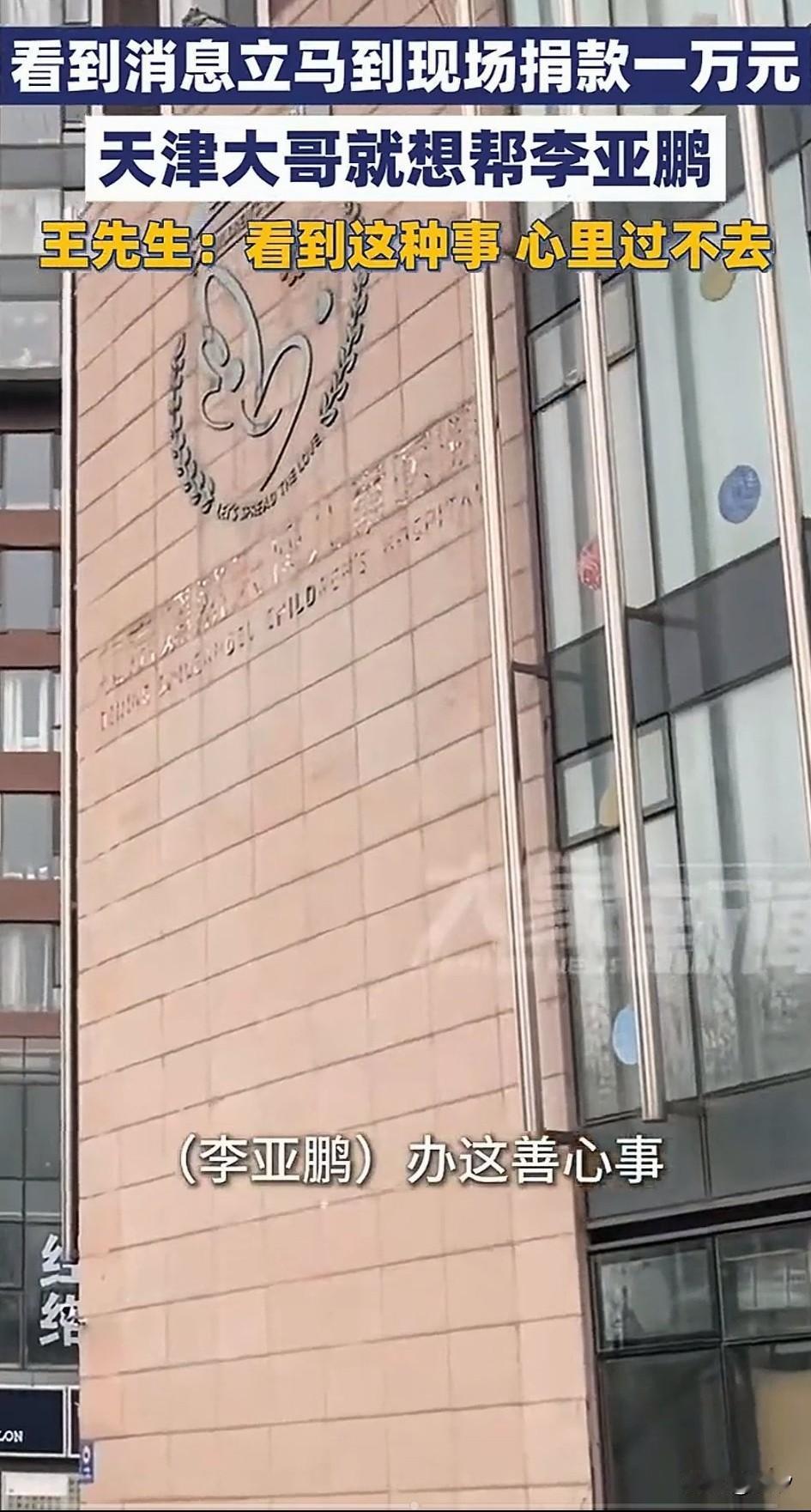 天津王大哥直是个大善人,因为他看到视频后,就直接从天津赶到了北京! 现场直接给医院捐款1万元,面对记者采访的时候,他竟说出了这种话! 看我的穿着,就知道我的条件也不好,但是我看到李亚鹏视频之后,知道他遇到了难处! 他办的这事,太暖心了,自己就给他捐款,要是有几百个,几千个人给他捐款,2000多万根本不是个事儿! 他自己也希望李亚鹏能够快速度过难关,嫣然儿童医院能够继续运转!去帮助更多的唇腭裂患者! 可以说嫣然儿童医院这事,就像一面镜,照亮了人们的心!大家很清楚他是在做好事, 这事就会像滚雪球一样,得到社会各界人士的支持,很多人都开始给他捐款!点滴之水汇成河,希望医院可以继续帮助有需要的人! 天津