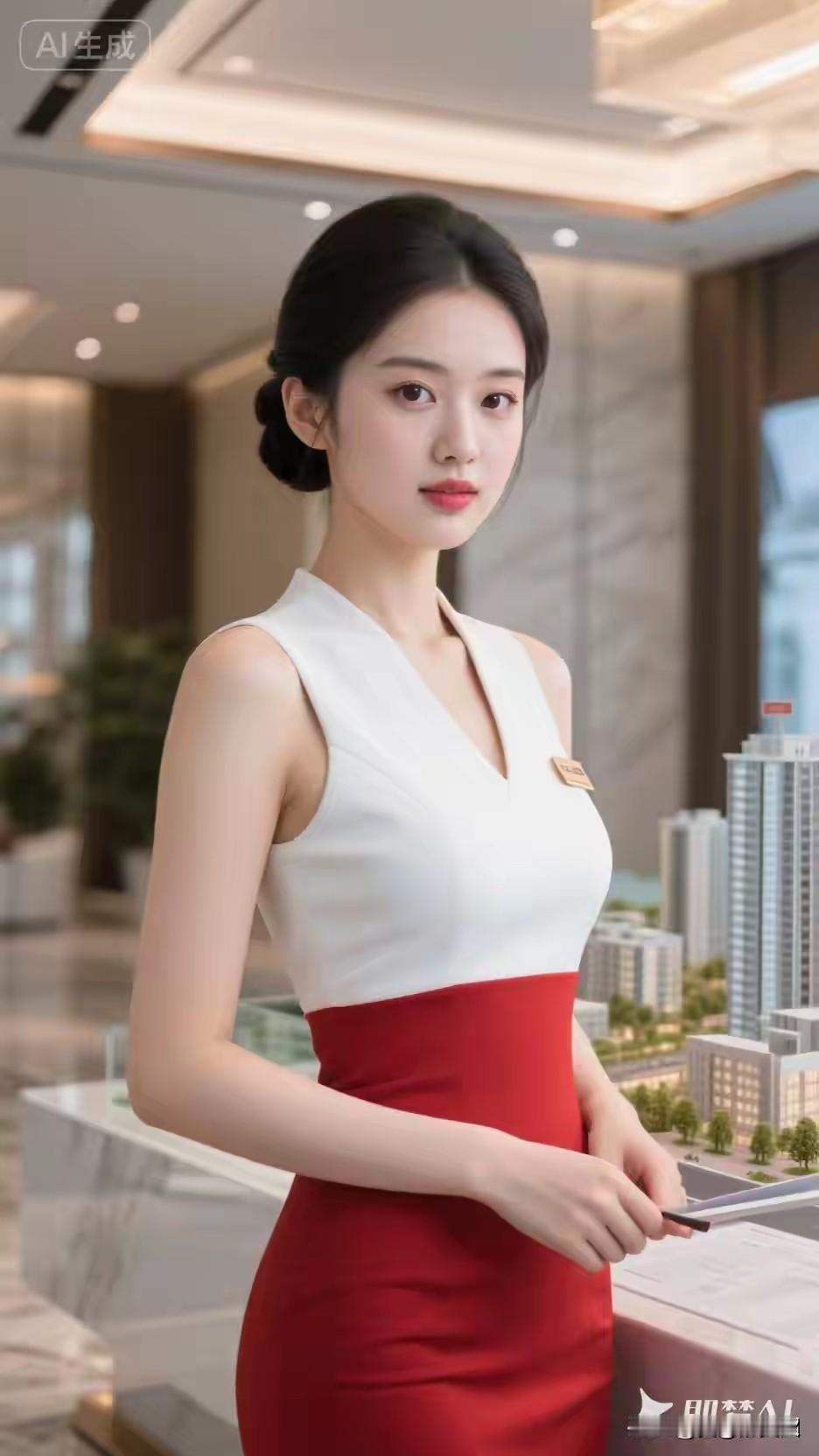东方佳丽,千娇百媚。 穿着紧身,白红无袖。 职业服装,端庄典雅。 身姿妙漫,曲线优美。 气质高雅,风情迷人。 回眸瞬间,令人陶醉。 一袭裙装雅韵生, 婀娜多姿步履轻。