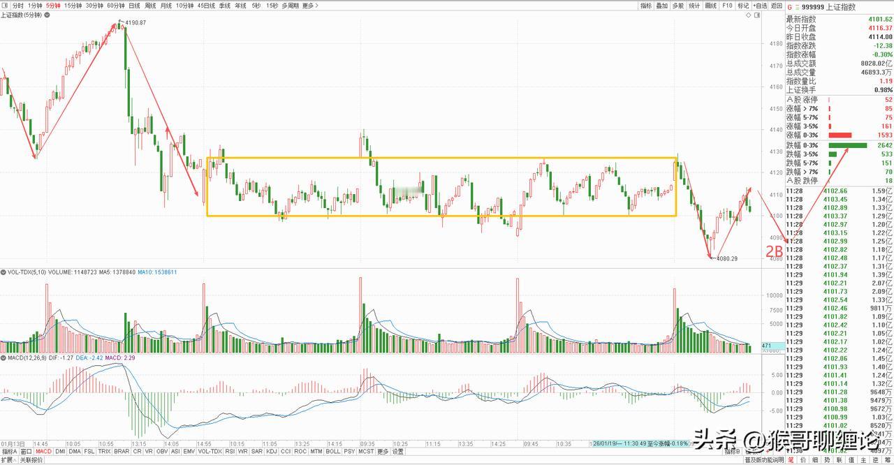 不破不立 大盘上午来了一个探底回升的动作,开盘便一路下跌,彻底击溃4100点,给人一种破位下跌的感觉,但又很快企稳回升,午盘收盘又刚好卡在4100点,一系列操作具有很大的迷惑性。昨天复盘就提到,今天要面临短线方向选择,从上午的走势看,已经有所动作,虽然空头率先发力没有成功,不过多头再不反击,那击破是必然的事情,就看券商板块下午动向如何。 从5分钟图上看,这里构建完成了一中枢下跌结构,同时出现了强有力的背驰买点,上午已经开始这笔买点的拉升,但力度不算大,只要下午回落不创新低,那就能反手构建二买,带动30分钟级别向上变盘。大盘行情