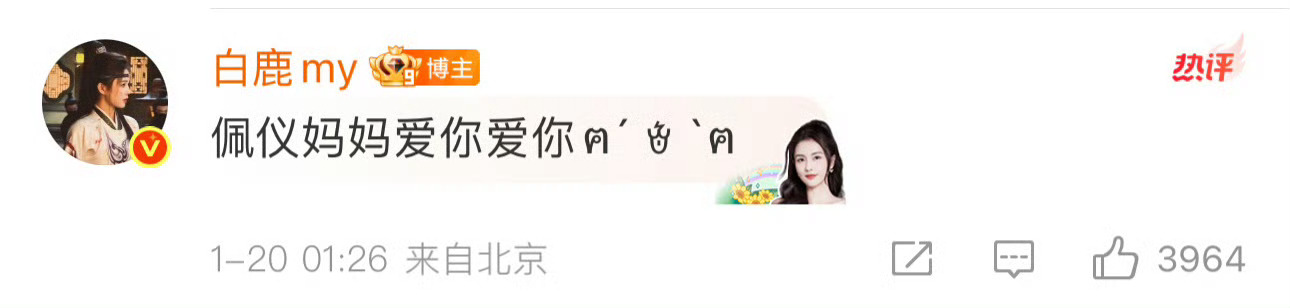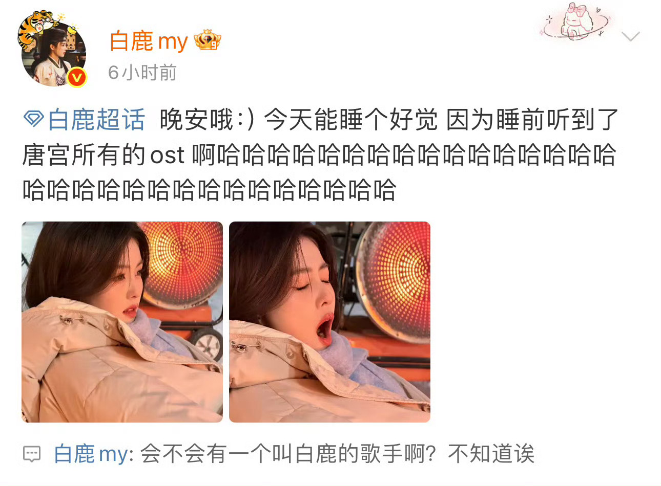 其实这次真不一样,白鹿会碎碎念,会半夜不睡去翻唐宫奇案的杀青文,会在下面发佩仪妈妈爱你爱你,会听完了OST忍不住分享,会直播说对唐宫奇案好喜欢好期待,对李佩仪不吝啬任何夸赞。