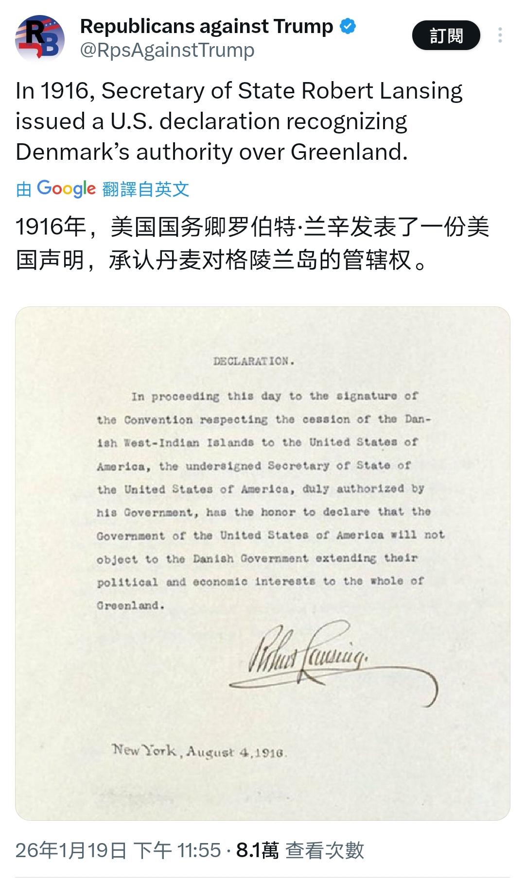 反川共和党人展出了一份留存于美国务院档案馆的历史文件 1916年8月4日,国务卿罗伯特·兰辛在丹麦西印度群岛割让条约中发表声明,称美国“不会反对丹麦政论将其政治和经济利益扩展到整个格陵兰岛。”这实际上等于承认了丹麦对格陵兰的管辖权。 声明的中“丹麦西印度群岛”,就是今天位于加勒比海地区的美属维京群岛,世人耳熟能详的罗莉岛就是美属维京群岛中的一座小岛。 Source: X