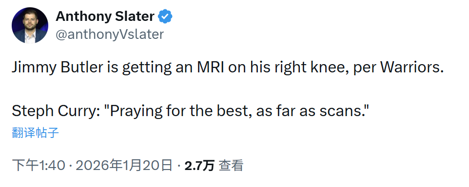 勇士队消息,巴特勒将进行右膝核磁共振检查已确定伤情。库里表示,希望检查结果一切顺利。科尔表示,现在球队气氛很低落,大家都在等消息。