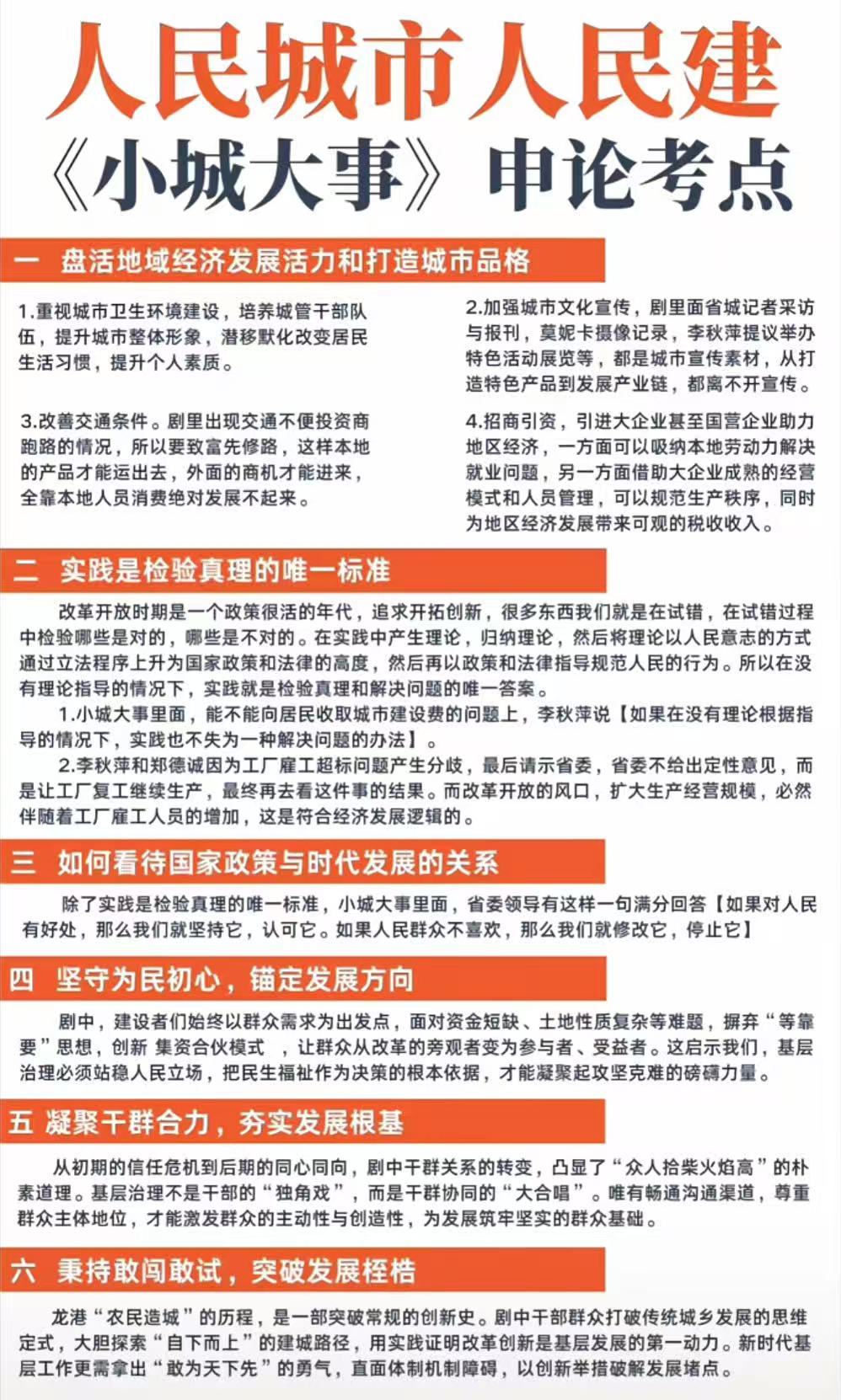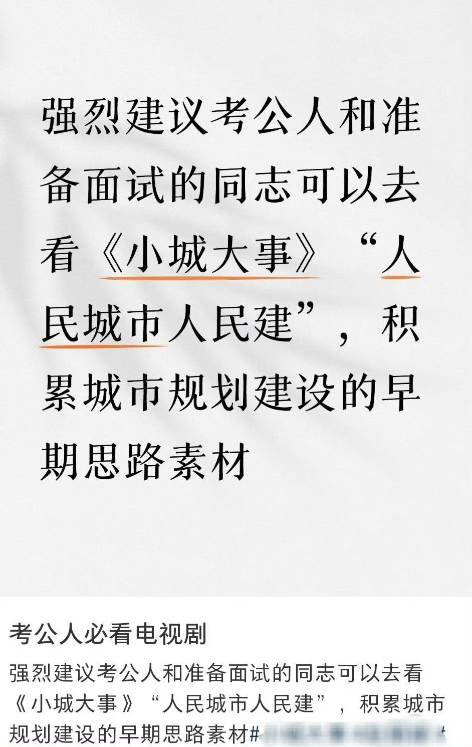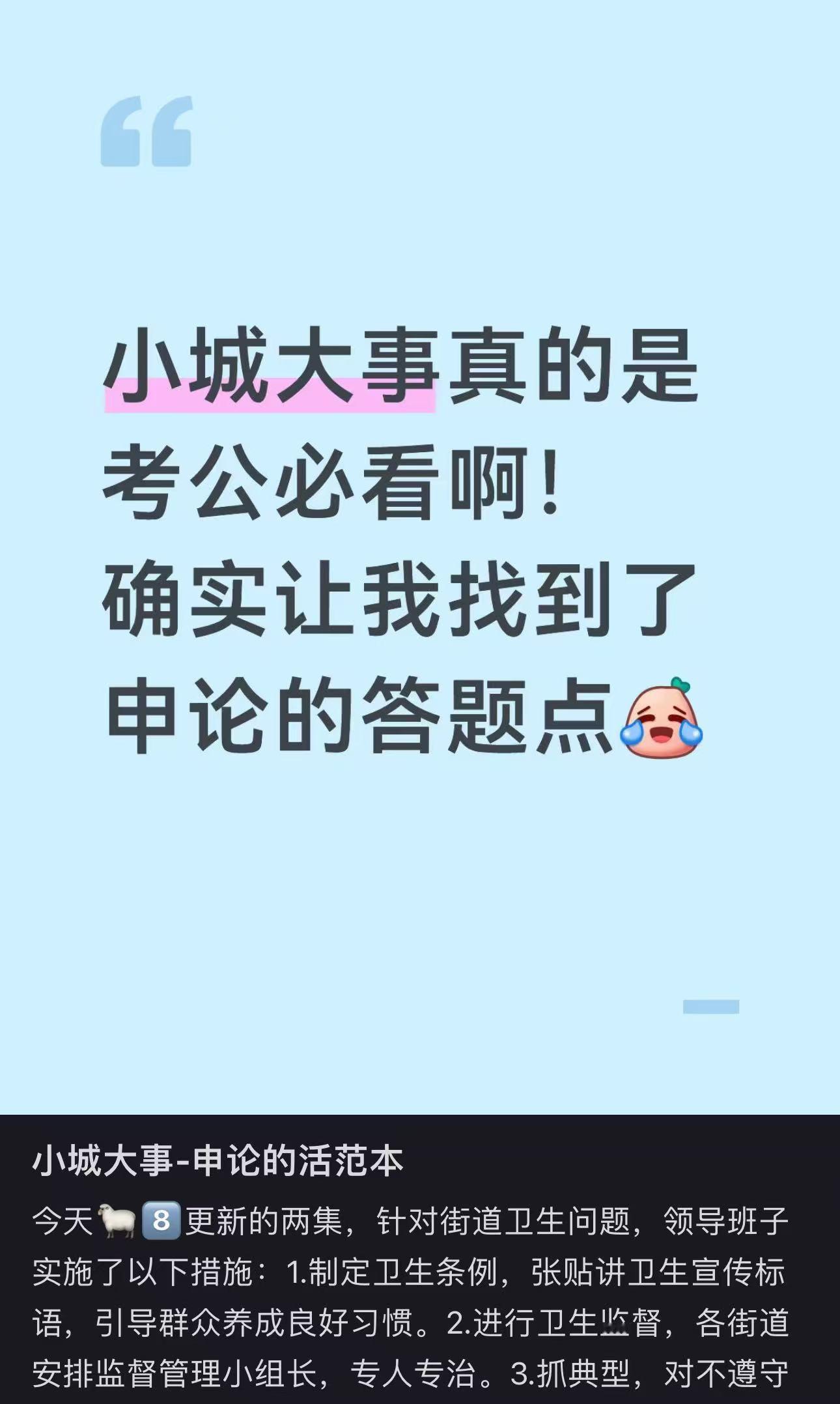 小城大事让我学到了东西 以前觉得申论素材离生活很远,直到看了《小城大事》。剧中每个事件都是基层工作的微观缩影,比如老旧小区改造中的多方协调,这种具体场景比教科书上的抽象理论好记多了,以后写大作文不怕没例子可举了。 小城大事