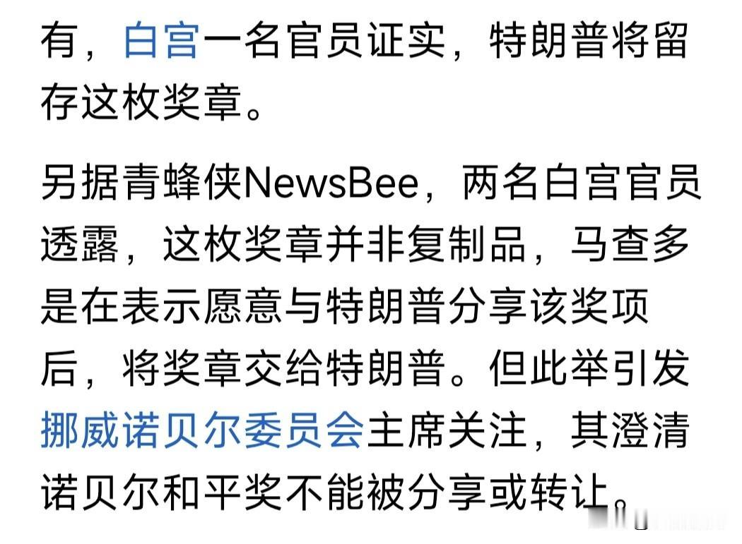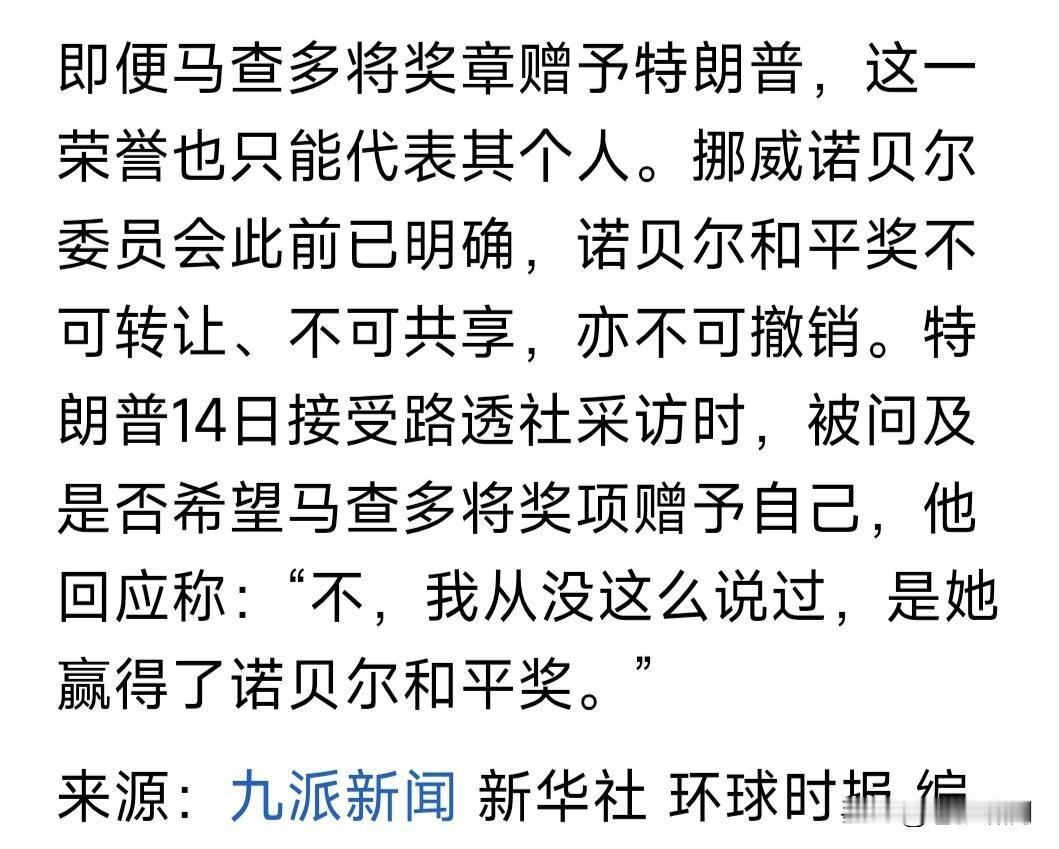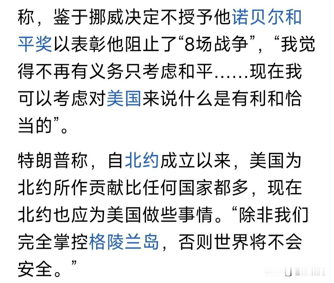 川普“不靠谱”,竟要挟诺奖评委会!给挪威首相写信:挪威不授他诺贝尔和平奖,他就无义务考虑世界和平! 他说:我上台已平息八场战乱,为世界和平做出重大贡献,你们竟视而不见?把诺贝尔和平奖颁发给马查多! 他还扯到北约:北约成立以来,美国做的贡献最大,北约应回报美国,让我们掌控格陵兰,否则世界无和平! 尽管马查多已把“获奖证书”送给老特,他还是不舒服!因诺奖评委会发声:诺奖不可转让、分享,不可撤销! 再就是还惦记着格陵兰,竟拿对北约贡献最大说事,对北约反对其兼并格陵兰泄愤,声称不再保证北约安全! 看老特以上言行,咋觉得像个小孩子?“不靠谱”到这个份上,真是世界少有,全球唯一!商人习性展露无遗。 1.挪威首相能改变诺奖评选结果吗? 2.你知道诺贝尔和平奖精髓是何吗? 3.北约宗旨是反侵略,如果同意你兼并格陵兰,不等于放弃原则了吗? 4.目前看川普兼并格陵兰,有三个办法:公投、购买与武力夺取!前两办法欧洲与格陵兰不同意,只有用武力? 估计这个也不行!因为会遭国内反对。已有反对派发声:若川普武力夺岛,马上对其发起弹劾!他敢冒这个险,拿自己政治生命做赌注,开玩笑吗? 如果为一个诺贝尔和平奖和格陵兰岛!川普耍性子出昏招,不仅得罪欧洲,冷落世界,颠覆二战秩序,导致全球大乱,断送总统前程!划得着吗? 既然有这精力能力,不如把俄乌战争解决好!如此将赢得欧洲尊重,巩固北约地位,获得世界拥护!确保总统大位,中期选举也无忧了!何乐不为? …………