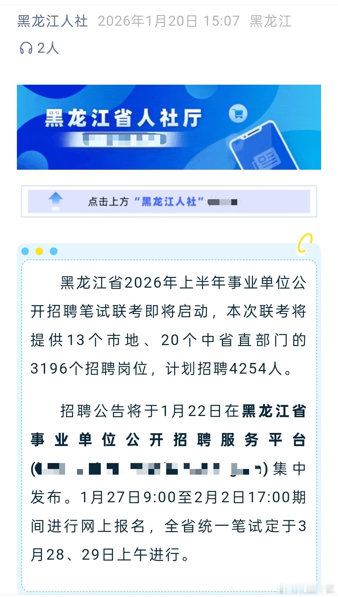 省考还没动静,事业单位先来了黑龙江事业单位招聘公告将于1月22号发布报名时间:1月27日9:00至2月2日17:00招聘人数:4254人笔试时间:3月28、29日黑龙江省考黑龙江事业单位