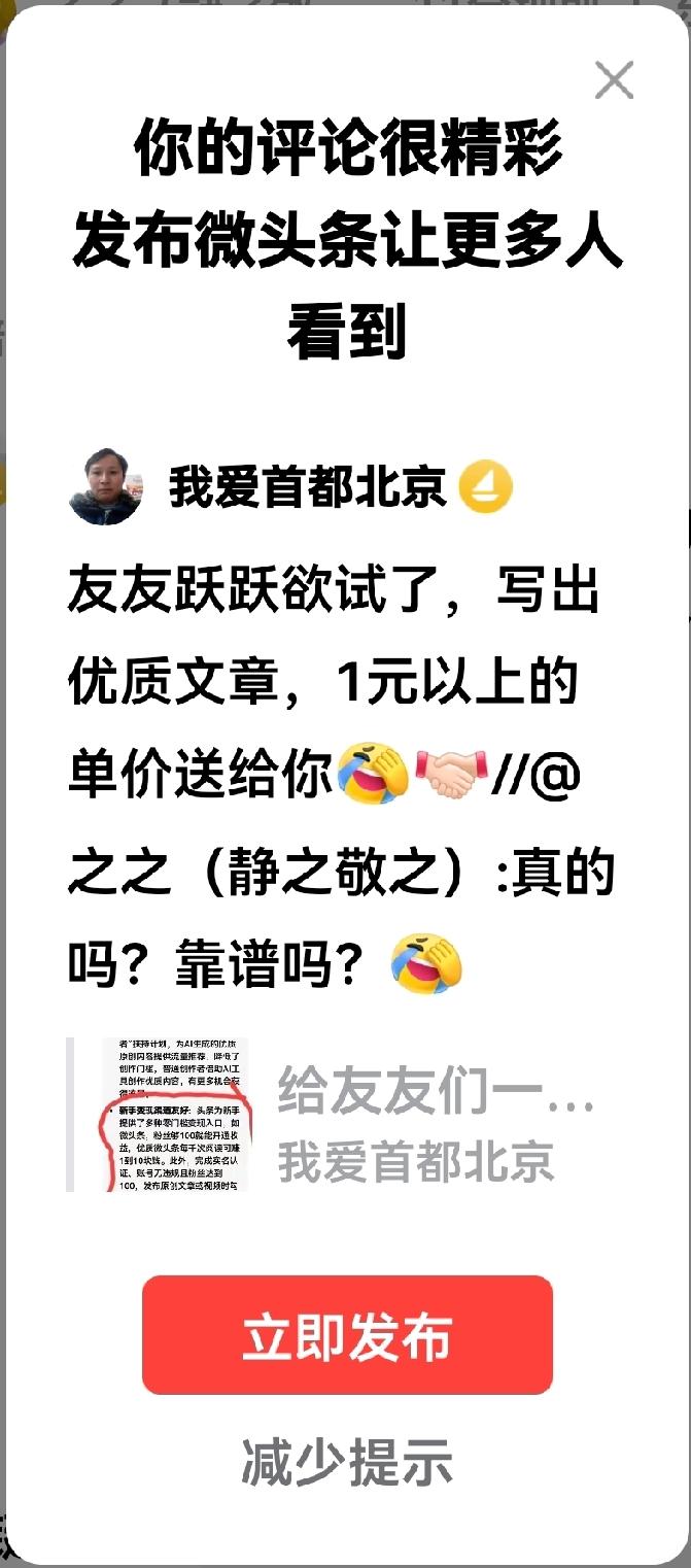 这几天、成了“评论精彩”专业户了。 随便一个评论,头条都要跳出弹窗,夸奖“你的评论很精彩”! 评论很精彩有用吗? 又没有一丝一毫的流量奖励! 更不用说现金了! 告诉头条、评论很精彩的口头奖励我不稀罕! 我要的是, 一句话, 几个字, 再加一张图, 叶子也好! 大蒜也罢! 你给我来一阵流量, 使劲的往里砸! 也让我享受一下大佬们的泼天大富贵!