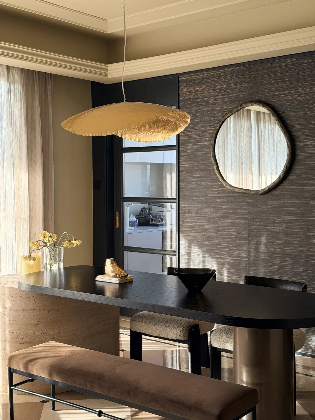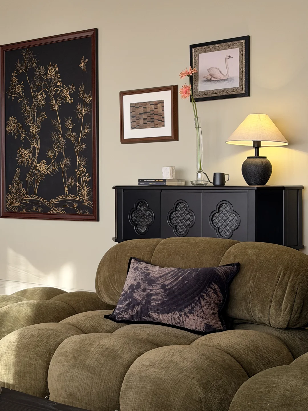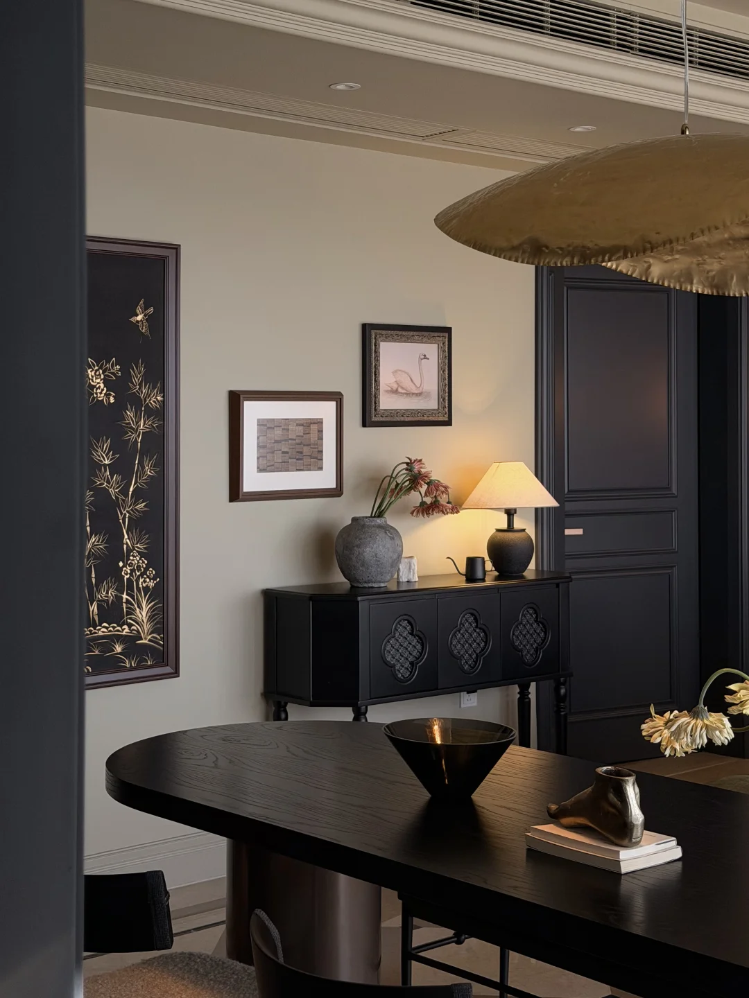 锦绣之城精装房改造实景落地(软装设计+硬装不改造) 美到直接在现场尖叫了 墨绿色的沙发真的摸一次就爱上 头顶那盏黄铜吊灯是手工敲的肌理 开灯的时候整个空间都在温柔发光 搭配深色木饰面和做旧挂画,复古又慵懒 阳光一照进来,氛围感直接拉满 悬浮感的餐桌 + 编织肌理墙,再配一面不规则艺术镜 早上阳光透纱帘洒进来,连吃吐司都像在拍杂志大片 做设计最开心的,就是把脑子里的浪漫,变成别人可以触摸的生活
