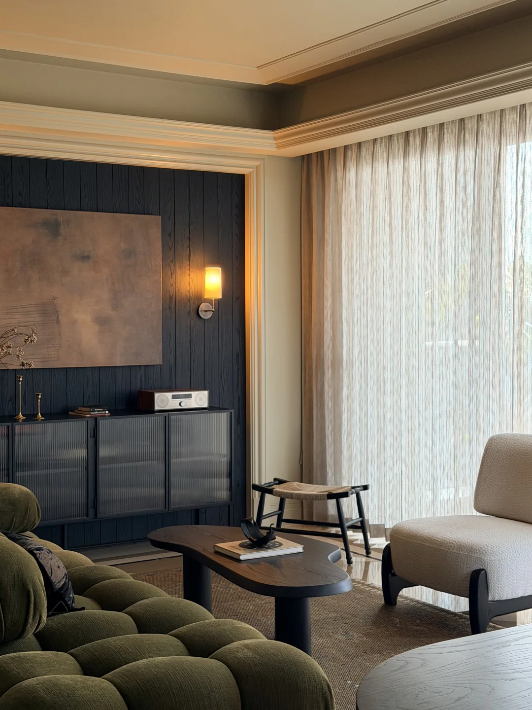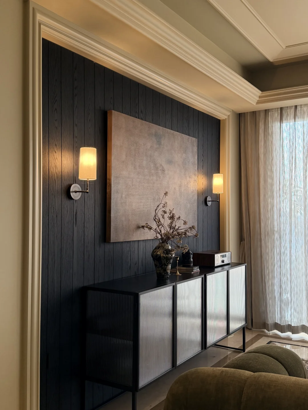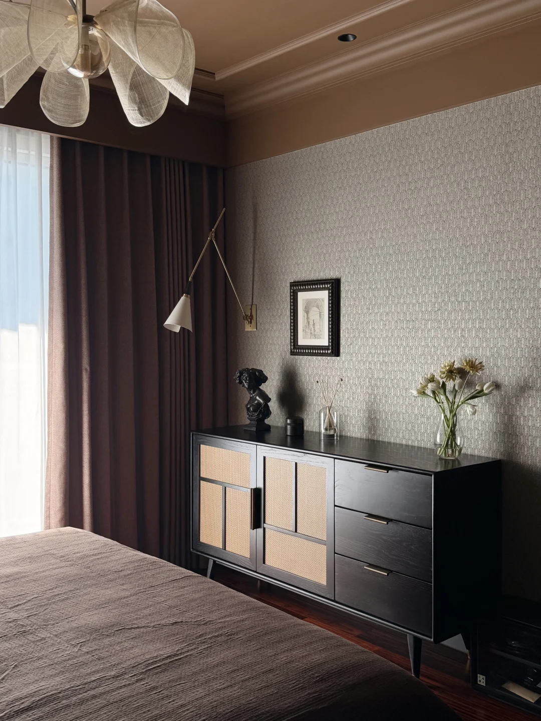 锦绣之城精装房改造实景落地(软装设计+硬装不改造) 美到直接在现场尖叫了 墨绿色的沙发真的摸一次就爱上 头顶那盏黄铜吊灯是手工敲的肌理 开灯的时候整个空间都在温柔发光 搭配深色木饰面和做旧挂画,复古又慵懒 阳光一照进来,氛围感直接拉满 悬浮感的餐桌 + 编织肌理墙,再配一面不规则艺术镜 早上阳光透纱帘洒进来,连吃吐司都像在拍杂志大片 做设计最开心的,就是把脑子里的浪漫,变成别人可以触摸的生活