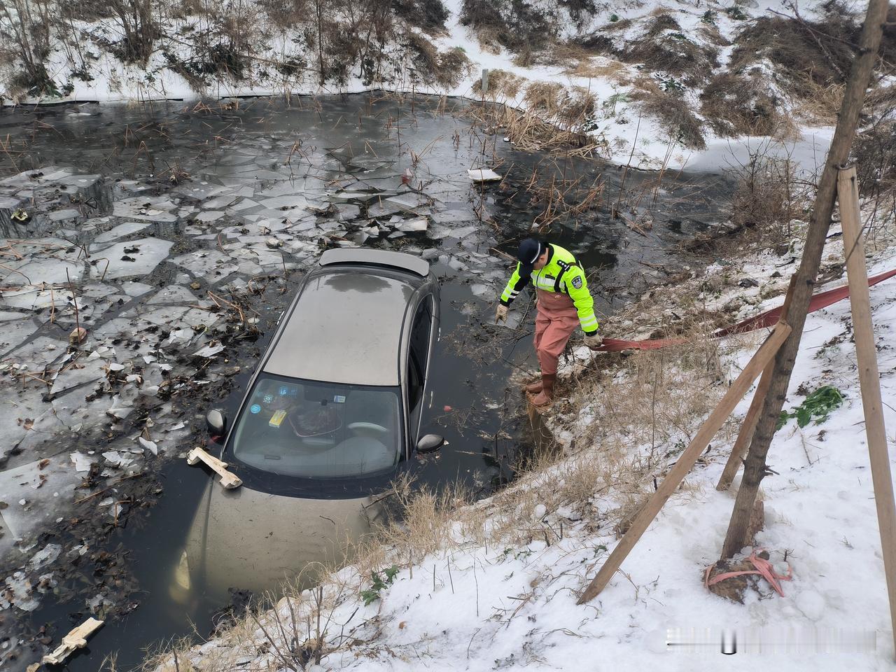 雪天轿车落水,交警冰河中勇救援 近日,一场大雪让道路湿滑难行。一辆轿车不慎滑入