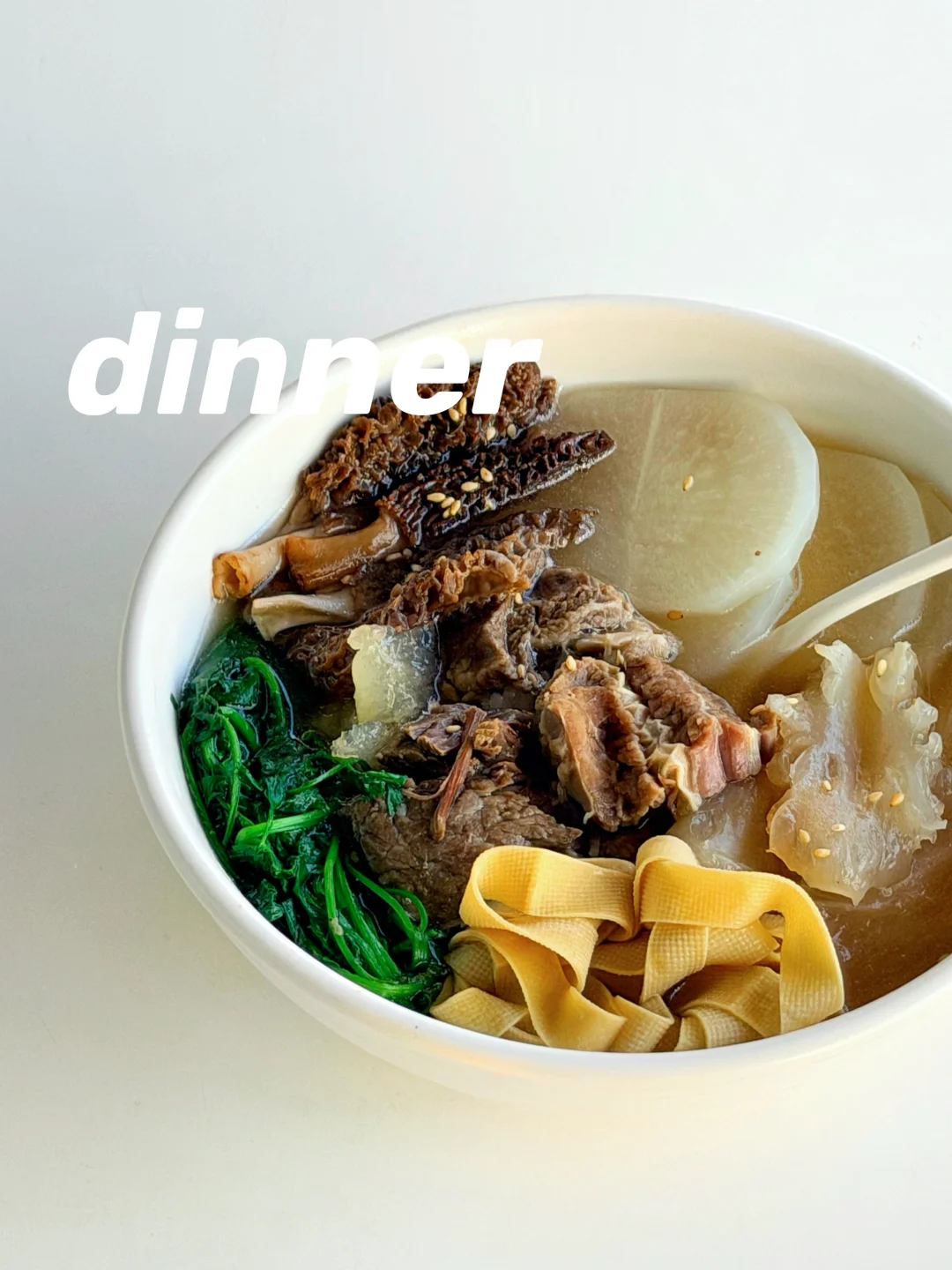 🥹疲惫不堪的一天,ENTJ的我,快要把自己消耗殆尽了[抓狂R][捂脸R][抓狂R]。 希望今天睡个好觉,明天又可以能量满满❤️。 . 💛晚餐盘 牛腩牛筋🐂/白萝卜/羊肚菌/千张/香菜 🧡制作方法 1️⃣昨天晚上提前炖好的牛腩牛筋,分装成好几份,拿出来可以直接作为煮物料理的底料,或者煮面底料; 2️⃣倒入开水煮开; 3️⃣加入白萝卜切片、羊肚菌,煮5分钟; 4️⃣加入千张,加盐调味,煮2-3分钟; 5️⃣加入香菜,关火即可。 —————————————————————————— 最近忙到没时间看大A和黄金,没想到惊喜不断[派对R]