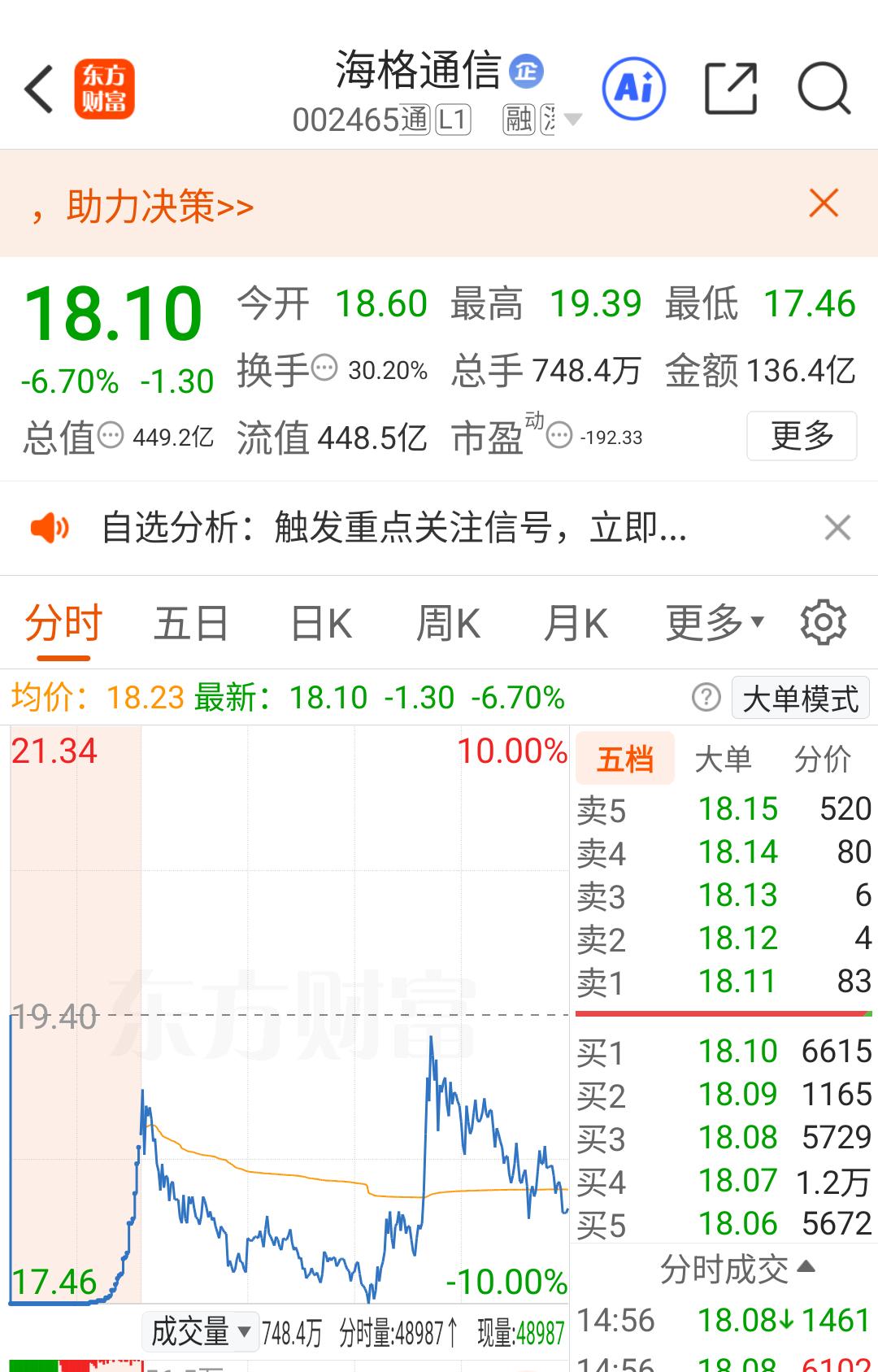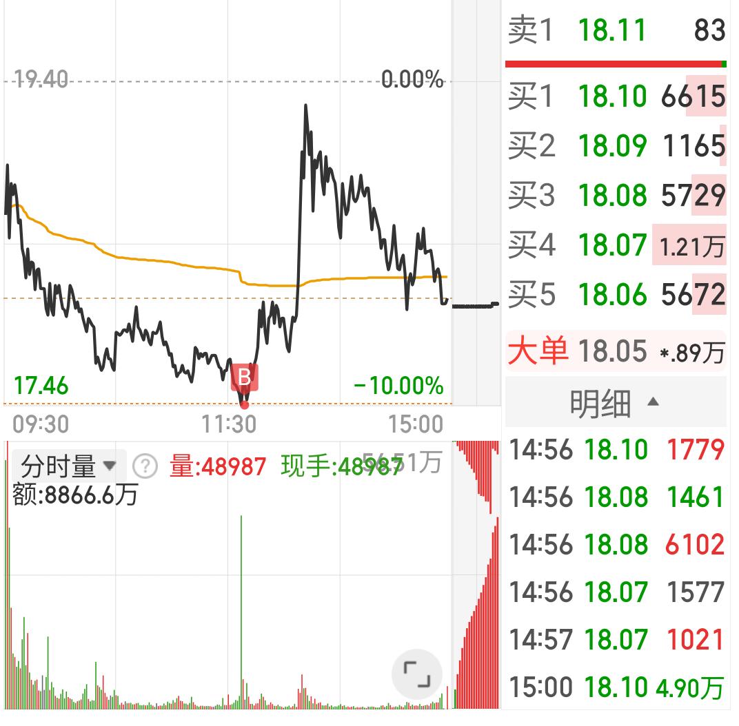 海格通信 下午1点07分超4亿大单砸跌停,到底是谁所为?而10.7万手一口吃掉跌停封单又是谁在反核? 海格,今天虽然如预期开板放人了,可今天的走势真的是让人惊心动魄。 集合竞价一路推高,眼看有希望红开,可顶不住整个板块集体负反馈。上午一路震荡下行,下午1点07分48秒,突然惊现一笔23.4万手,超4亿的大单直接砸到跌停价。 可奇妙的是仅隔9秒,又有一笔10.7万手的超1.8亿的单子一口吃掉了跌停板上的封单,从此便开启了反核之战,最高拉到离水面不到1个点就会翻红。然后……就没有然后了。看得人真的是惊心动魄,为了更好的体验这种心跳,我也第一时间加入了多头部队。 今天换手30.2%,成交量136.4亿,在4个跌停的位置出现历史天量,可见里面的大佬们博弈有多么激烈。后续又会怎么走? 疑惑一:到今天下午17.46的价位已经是第4个跌停板了,从最高点26.62算,跌幅已经达到了34.41%,在这样的损失或者回撤情况下,谁还狠心一把砸出4个多亿?难道这真的只是一串数字吗? 疑惑二:翘板的10.7万手超1.8亿的大单又是谁所为? 难道正如我昨天盘后所预测的,是陈小群来自救了?因为昨天的三日榜显示,他里面还套着1.62亿,都是26.62那天打板进的。今天的反核自救,我猜大概率是他,今天能做9个点的T,也是相当相当牛的。 以上都只是疑惑和自己猜测,今天的详细数据我也看不到,也许过两天再有龙虎榜出来,大概就知道今天到底是谁4亿砸的跌停,又是谁1.8亿救的场。 (申明:以上只是个人跟踪观察学习体验的记录和猜测,绝非荐股,股市有风险入市需谨慎,盈亏只能自负,不要转了就说群总多么多么牛,亏了就全网到处留言骂人家,这不是一个成年人该有的行为。)