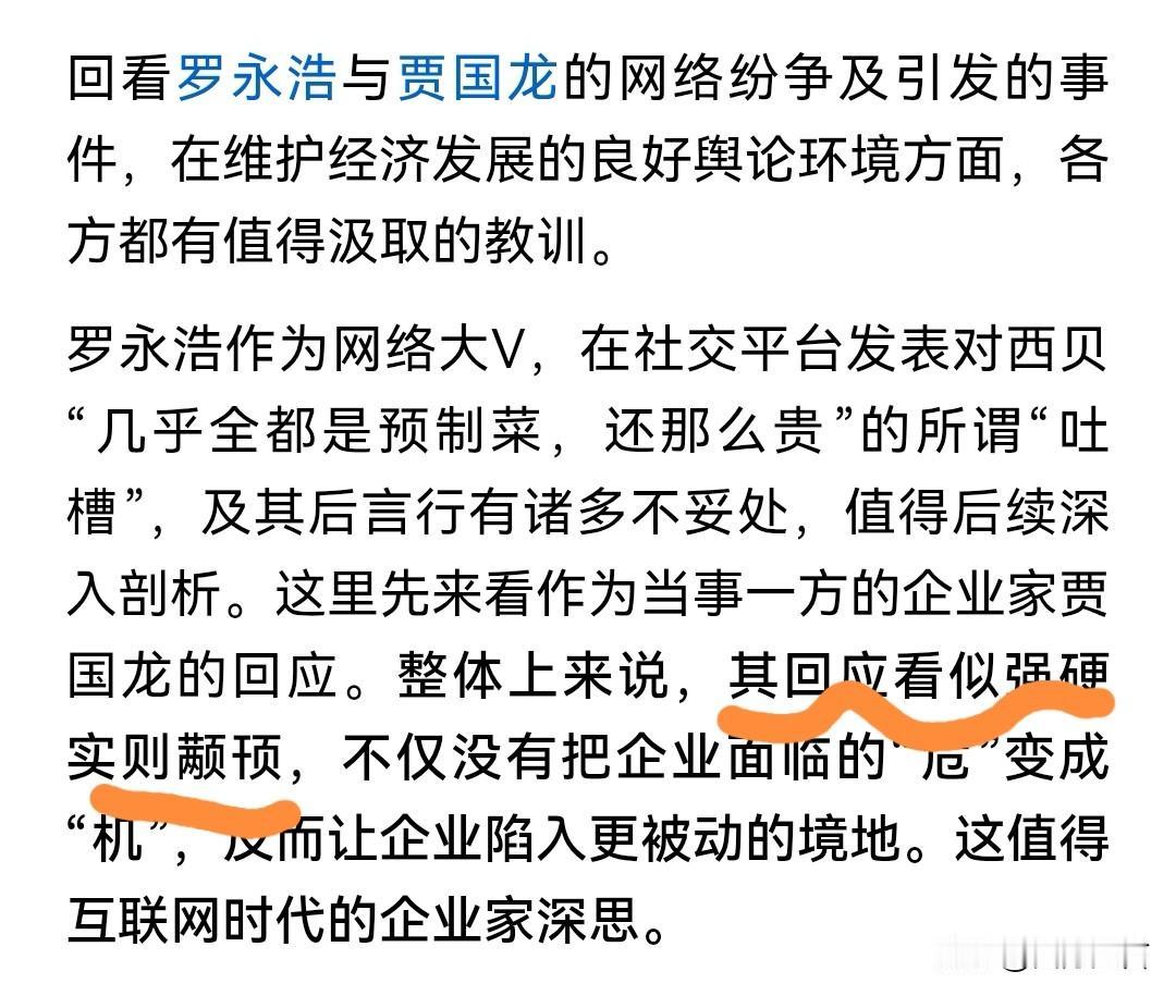 人民日报批贾国龙“颟顸”,意思是糊涂,莽撞! 二批老罗,挟粉丝以令诸侯,产生了错误的示范效应。 根上还是因为预制菜是一个以后还要发展的产业,你们俩互喷没关系,不能把产业喷没了,把上下游这么多就业喷没了! 所以亲自下场,各打五十大板!