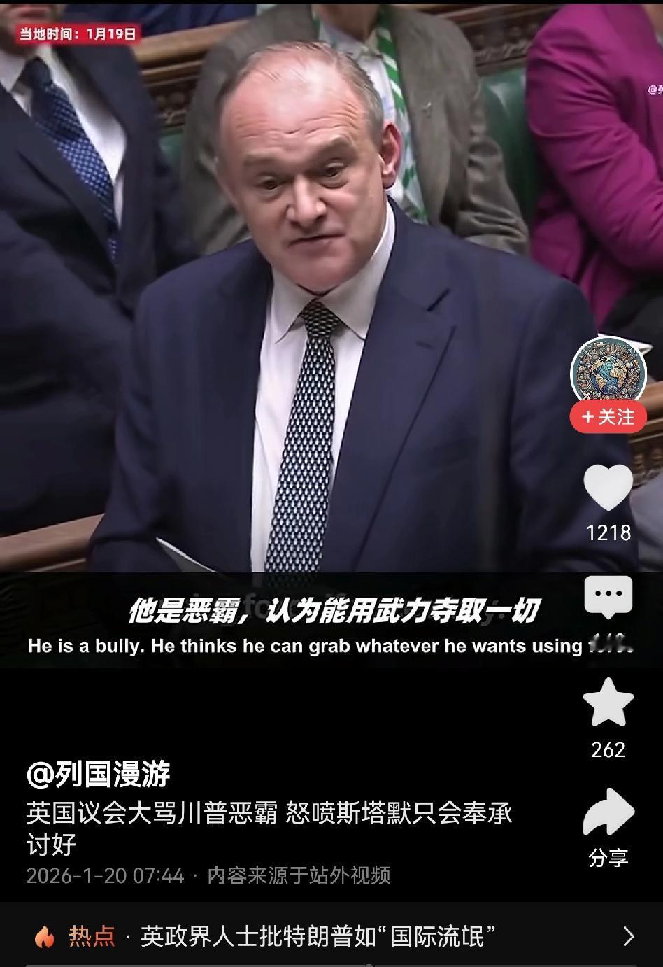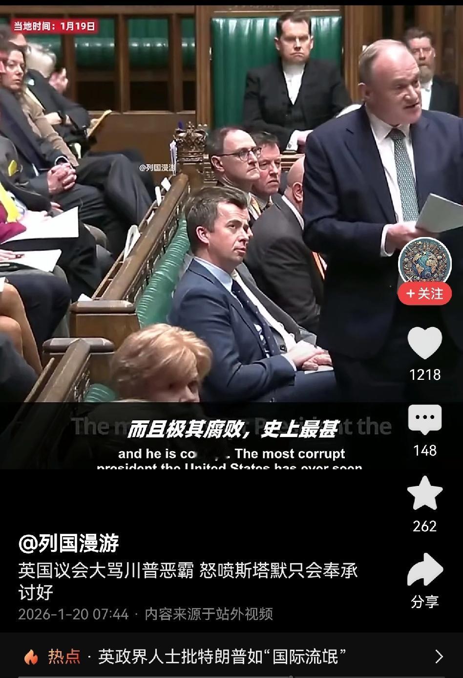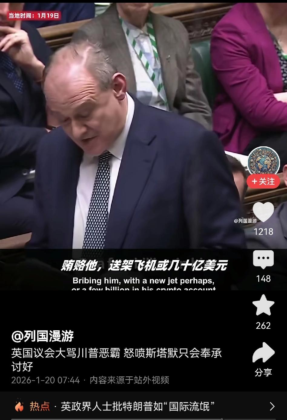 英国也有清醒硬气的政客,在议会上,当众对布莱默和特朗普的批判可谓毫不留情,一针见血: 骂布莱默:对特朗普只知奉承巴结,生怕挨关税大棒,纯粹软骨头一个,绥靖政策完全失败。 骂特朗普:滥施武力,极其腐败,史无前例,必须认清其真面目,要么投其所好,贿赂他,送架飞机或几十亿美元,要么联合欧洲盟友共同施压,像对付恶霸一样强硬对抗他! 其实,他说出了所有有基本良知的欧洲政客的心里话。相比那些敢怒而不敢言的懦夫政客们,他是真的勇士,他是英雄! 伟人说:星星之火,可以燎原。大不列颠的这点星火,能烧到欧洲大陆和美洲大陆吗? 让我们拭目以待,好戏在后头。 人怨天怒时,恶霸终有恶报。