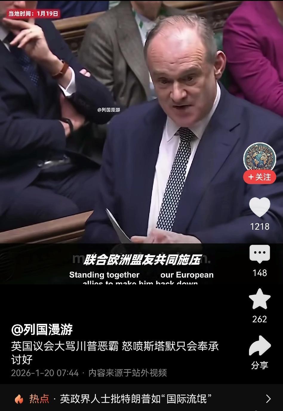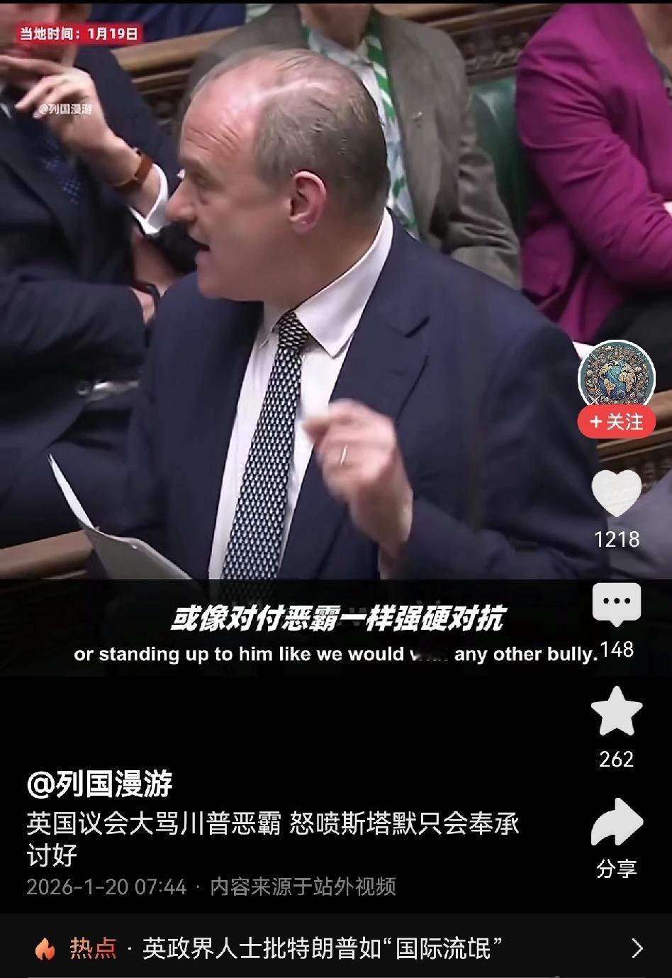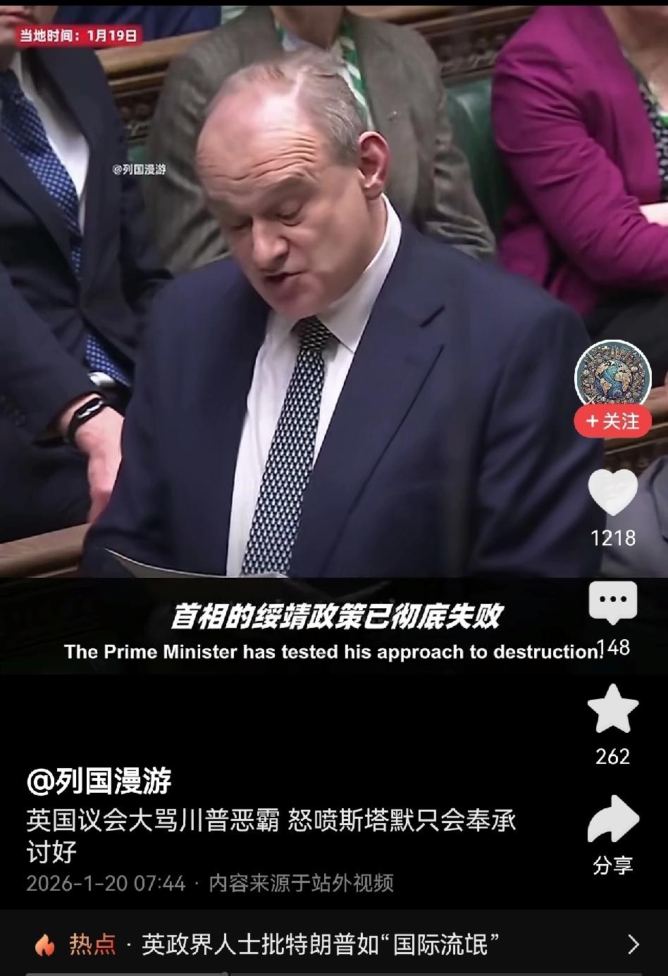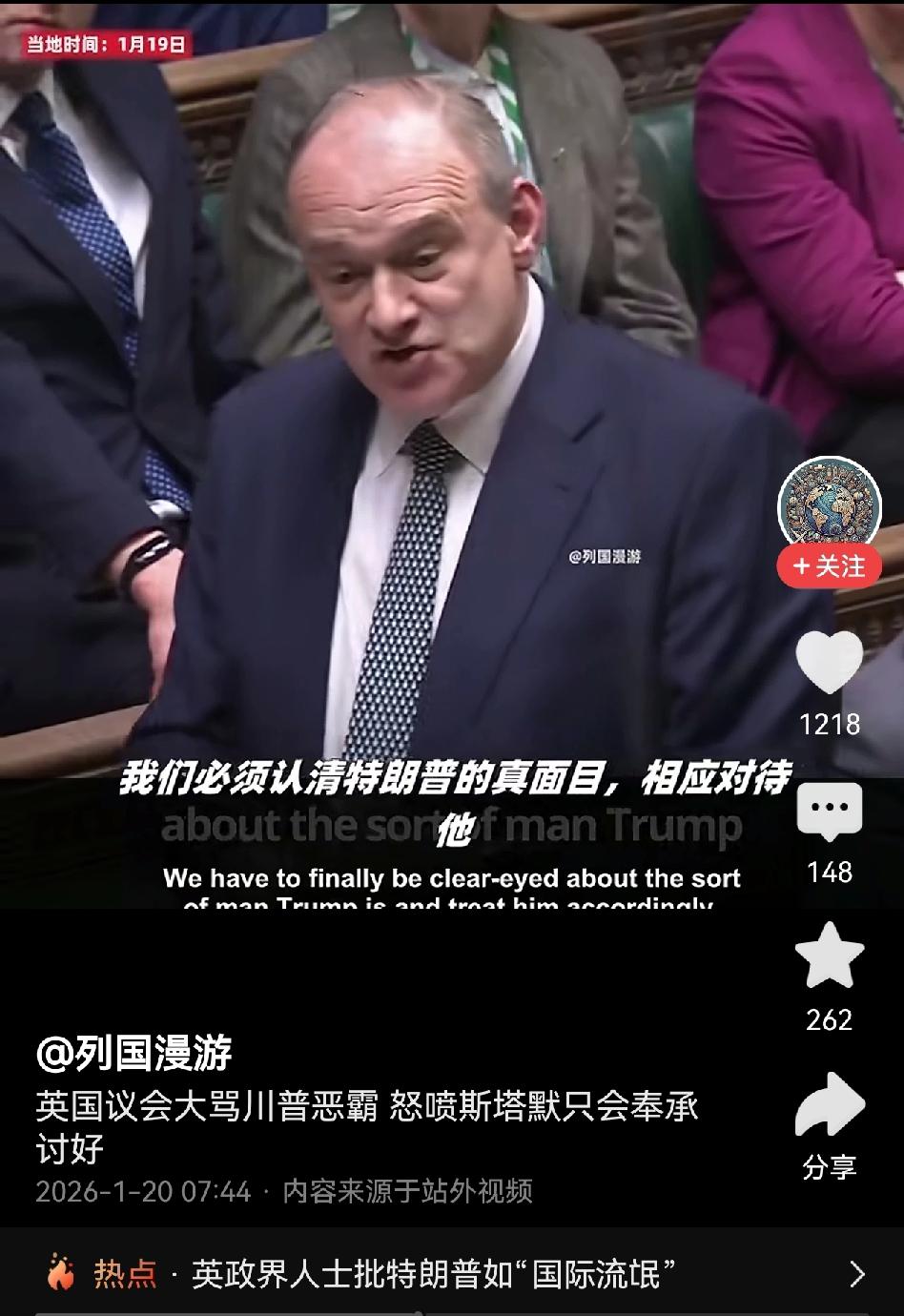 英国也有清醒硬气的政客,在议会上,当众对布莱默和特朗普的批判可谓毫不留情,一针见血: 骂布莱默:对特朗普只知奉承巴结,生怕挨关税大棒,纯粹软骨头一个,绥靖政策完全失败。 骂特朗普:滥施武力,极其腐败,史无前例,必须认清其真面目,要么投其所好,贿赂他,送架飞机或几十亿美元,要么联合欧洲盟友共同施压,像对付恶霸一样强硬对抗他! 其实,他说出了所有有基本良知的欧洲政客的心里话。相比那些敢怒而不敢言的懦夫政客们,他是真的勇士,他是英雄! 伟人说:星星之火,可以燎原。大不列颠的这点星火,能烧到欧洲大陆和美洲大陆吗? 让我们拭目以待,好戏在后头。 人怨天怒时,恶霸终有恶报。
