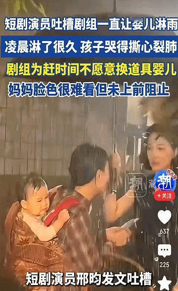 凌晨十二点,洒水车对着一个不到一岁的娃狂浇冷水,半小时,真雨戏。孩子哭到没声,脸青打抖,背他的女演员想拿伞遮,导演一句“别挡脸”就把伞挪开,娃继续当喷头。假娃娃不用,省时间,片酬800,爸妈现场,脸色难看却没抱走,只催“快点拍完”。拍完热搜爆,网友骂疯了:道具是娃,保暖没有,良心也没有。法律摆在那,虐待罪门槛不高,就看有没有人真的去摁按钮。短剧七天一部,不是免死金牌,再赶工,也不能把娃的命当进度条。