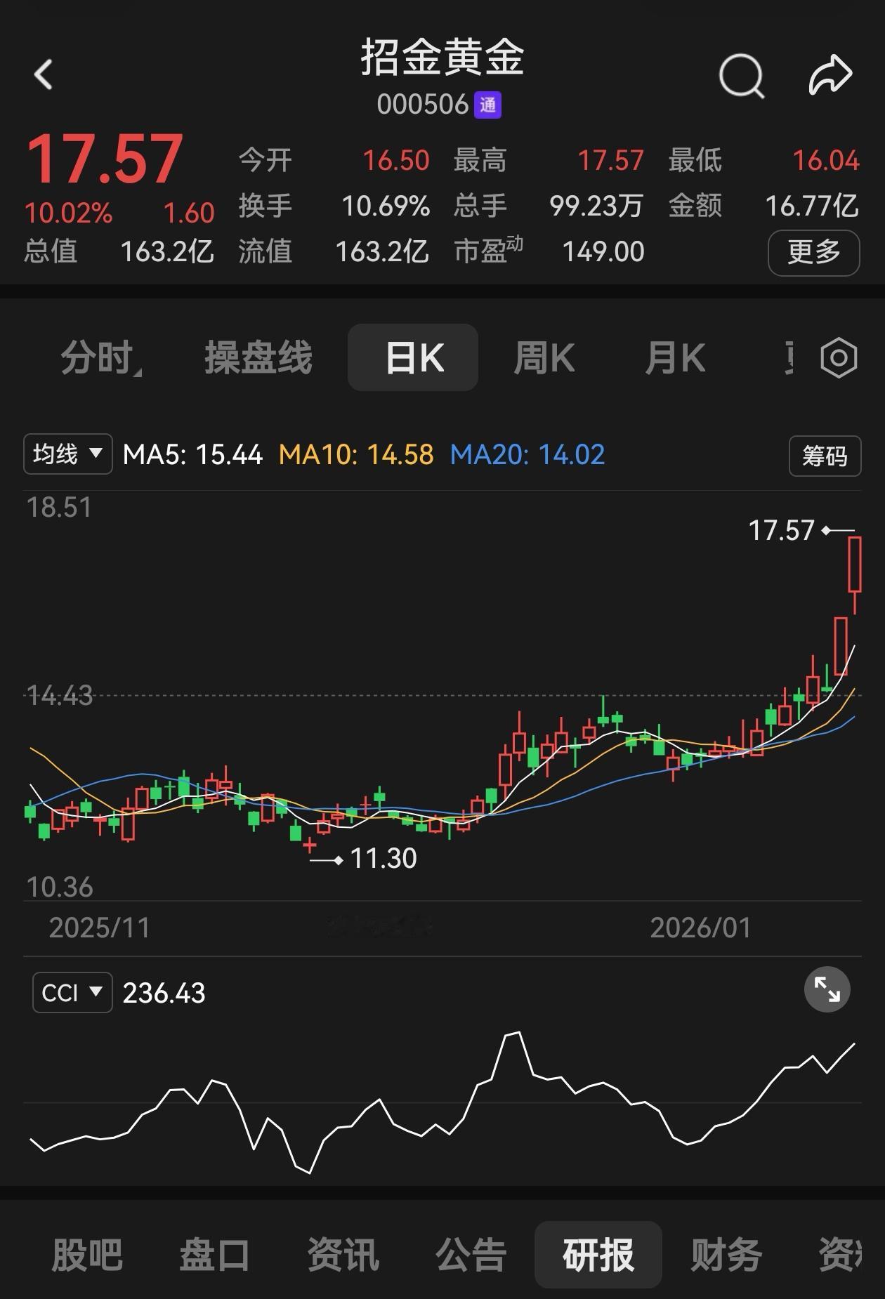 《招金黄金(000506):招金纳财》 原创‖文/山逸,版权归本人所有。 正文 当COMEX黄金夜盘以3.83%的暴涨幅度撕开牛市新空间,招金黄金(000506)以1月20日涨停板的强势姿态,成为引领板块突围的核心旗帜。从1月19日的震荡攀升到20日13点26分精准封板,再到夜盘贵金属市场的持续助攻,这只总市值163.23亿元的黄金标的,正迎来“行业东风+产能拐点+资金共振”的三重机遇,三连板预期背后,是基本面与情绪面的深度契合。 一、金价破局:4700美元关口的行业红利暴击 黄金板块的强势绝非偶然,而是全球宏观逻辑与技术趋势的双重确认。1月20日,伦敦金现突破4716美元/盎司,COMEX黄金同步创下历史新高,日线级别形成标准上升通道,1月累计涨幅已达8.8%。这波上涨是四大核心逻辑共振的结果:美国债务超38万亿美元引发美元信用担忧,全球“去美元化”加速推动央行购金潮;市场押注2026年美联储降息2-3次,实际利率持续为负降低黄金持有成本;特朗普关税威胁升级与全球地缘局势动荡,强化黄金避险属性;加密货币资产冻结事件频发,资金转向黄金寻求安全配置。 中银国际更是乐观预测,2026年平均金价将同比飙升40%至4800美元/盎司,2027年有望进一步升至5200美元。作为黄金销售占比超98%的纯标的,招金黄金成为行业红利直接受益者。2025年三季报显示,公司前三季度营收同比激增119.51%,归母净利润8216.05万元实现同比扭亏,其中Q3单季归母净利润同比暴涨206.58%,量价齐升逻辑已然兑现[__LINK_ICON]。随着夜盘黄金价格进一步突破,公司产品销售单价将同步抬升,45.13%的毛利率水平有望持续优化,业绩弹性将在后续财报中持续释放。 二、公司攻坚:产能释放与降本增效的成长闭环 招金黄金自身的α逻辑为股价提供了坚实支撑。国资入主后,公司聚焦黄金主业,核心资产斐济瓦图科拉金矿的技改与扩张成为成长核心引擎。目前该金矿排水工作基本完成,正推进采场作业面恢复,计划2026年底实现“2000吨原矿+3000吨尾矿”满负荷运行,北岛同步规划2000吨产能,2027年前后达产后,年黄金产量有望提升至约4.5吨,远期2030年目标直指10吨。 成本控制方面,公司已实现显著突破:完全成本由并购初期的900元/克以上降至目前的550-560元/克,管理层目标2027年前后压降至500元/克以下,中长期有望触及400元/克的理想水平。同时,1800万吨尾矿资源(品位1-1.5g/t,收率40%)的综合利用,将成为额外利润增长点。外延扩张方面,公司明确“每年并购一个在产或近产项目”的策略,境内聚焦招金集团现有矿山外区域,境外布局非洲、中亚等地区,斐济北岛595平方公里探矿权预计2-3年完成投产前工作,未来五年资源量目标直指300-500吨。 机构对其成长潜力高度认可,瑞银维持“买入”评级,将目标价上调至37港元,预计2025-2027年盈利年复合增长率达54%;中银国际同样给予“买入”评级,目标价高达44.78港元,将其列为中国黄金行业首选标的之一。 三、盘面解析:资金博弈下的三连板动能 从交易层面看,招金黄金的涨停具备坚实的资金与技术支撑。1月20日,公司股价以16.50元开盘,盘中最高触及17.57元涨停价,最终以10.02%涨幅收盘,换手率高达10.69%,成交额达16.77亿元,量能充分释放彰显市场关注度。资金流向方面,尽管主力资金净流出8882.52万元,但游资与散户资金分别净流入8335.32万元和547.2万元,板块联动效应下,资金接力意愿强烈。 技术形态上,公司股价自2025年摘帽以来实现近10倍涨幅,近期从1月16日的14.52元起步,短短三个交易日累计涨幅超20%,形成陡峭上升趋势。而COMEX黄金夜盘3.83%的暴涨,为A股开盘提供强烈情绪催化,黄金板块联动效应有望持续发酵,为三连板攻坚提供助力。当前公司163亿元总市值,距离机构预测的2027年600亿目标市值仍有较大空间,估值与业绩双修复逻辑尚未完全兑现。 结语:招金纳福,乘势而上 在黄金牛市确认打开、公司产能进入释放期、资金情绪持续升温的三重共振下,招金黄金的投资价值日益凸显。短期来看,COMEX黄金暴涨为三连板提供直接动能;中长期而言,产量翻倍、成本下降、资源增储的成长路径清晰,叠加九部门《黄金产业高质量发展实施方案》政策红利,公司有望充分享受行业集中度提升与智能化转型的时代机遇。 风险与机遇并存,投资者需警惕金价波动、海外运营及短期债务压力带来的潜在风险,但不可否认的是,在全球避险情绪与资产荒背景下,兼具β属性与α动能的招金黄金,正站在新的成长起点。招金纳金,纳的是黄金牛市的行业红利,纳的是产能释放的成长潜力,更纳的是资金共识下的价值重估机遇。
