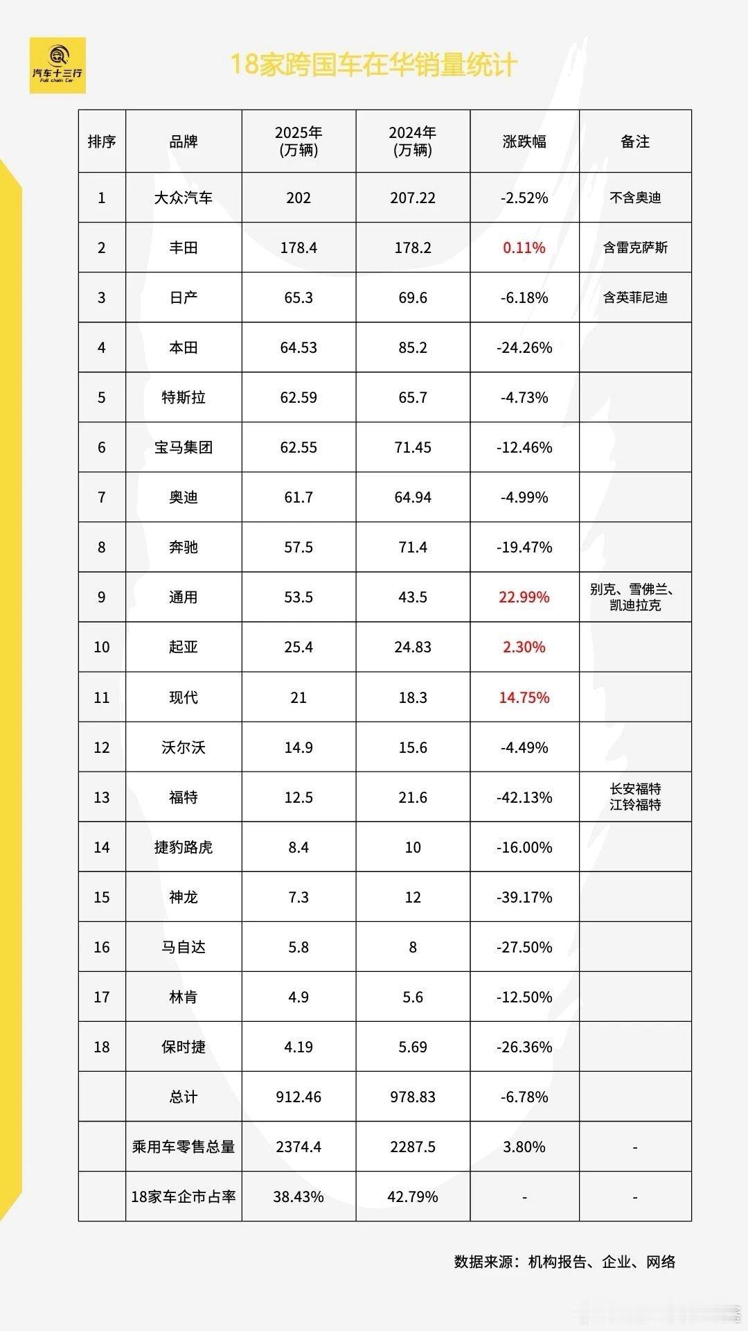 用了几天时间,我们总结了18家在华发展的主流跨国车企2025年发展表现,并围绕不同企业的发展做了对应分析,都知道跨国与合资车企今年丢失了许多份额和市场话语权,但跨国车企的马太效应等各种现象出现,丰田和大众占据跨国车企在华一半份额,50-60万市场份额决战于每个月或每个车型,豪华品牌正在对抗中迎来U型发展得上升期,日系车一个日产顶两个本田的现象值得研究,韩系车靠出口盼来了一丝曙光,沃尔沃靠安全和2024年基本持平,保时捷中国市场业务距离和亚太区业务合并越来越近,我们来看看18家跨国车企2025中国众生相,双寡头吞噬近半份额,超豪难掩退市兼并之困。车圈大事件大v聊车