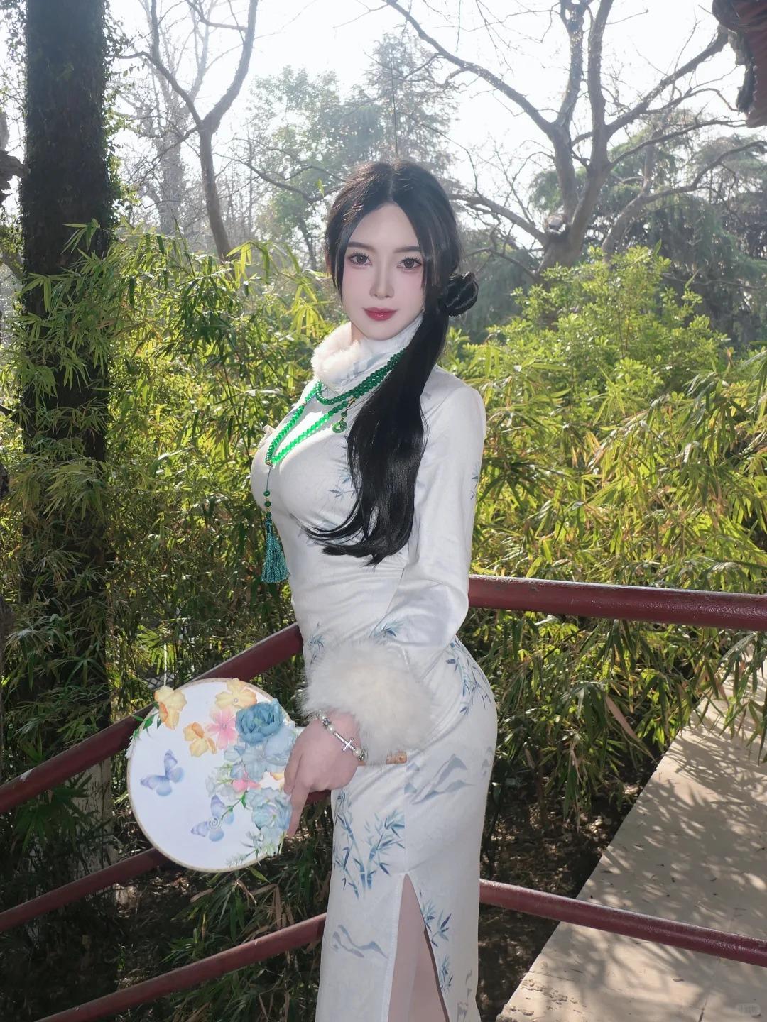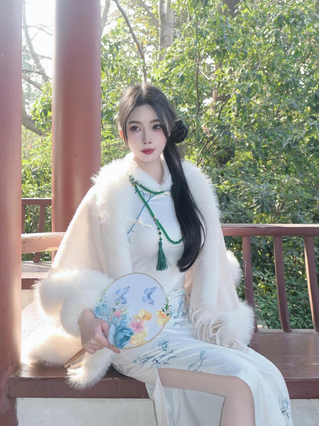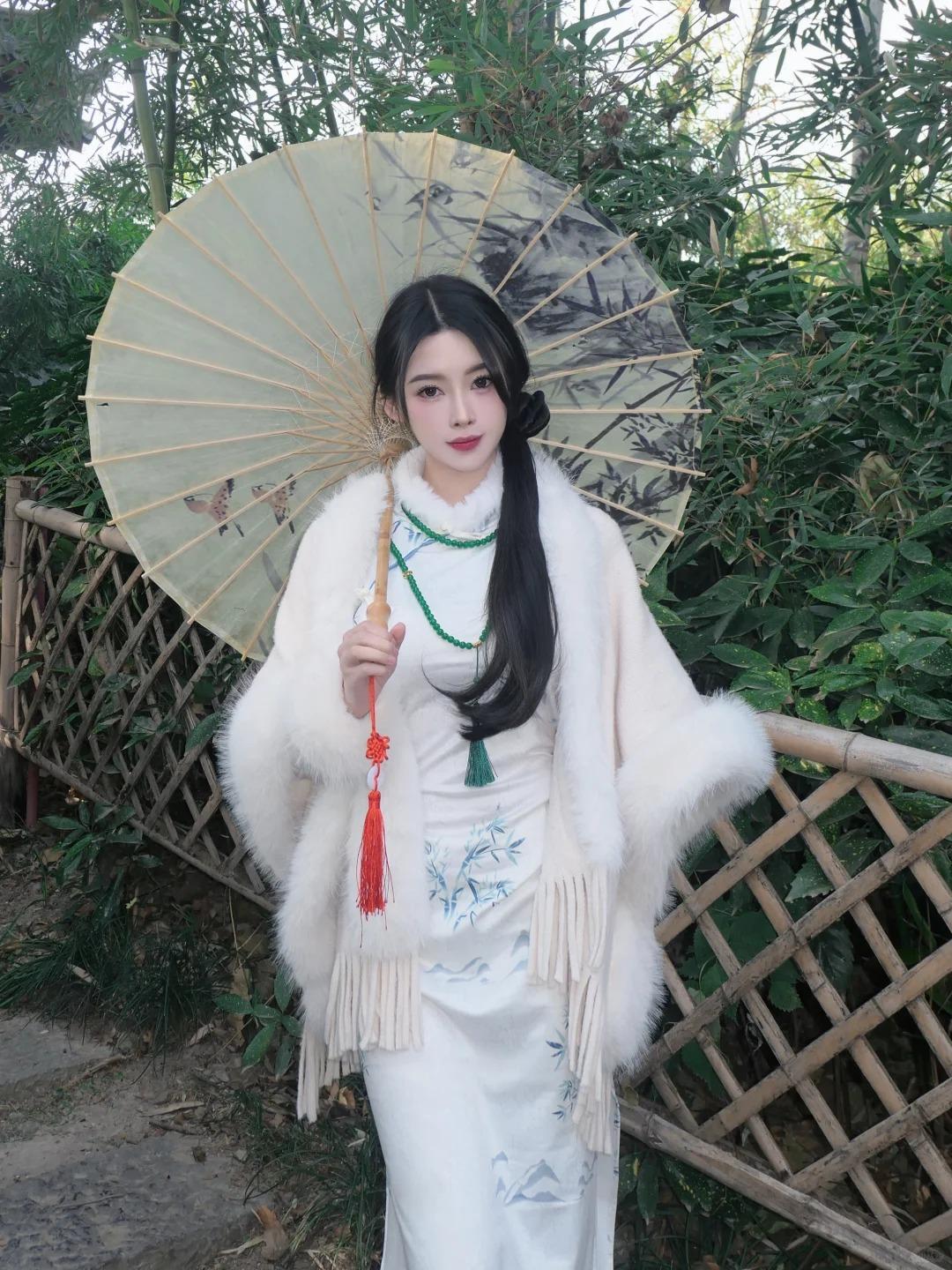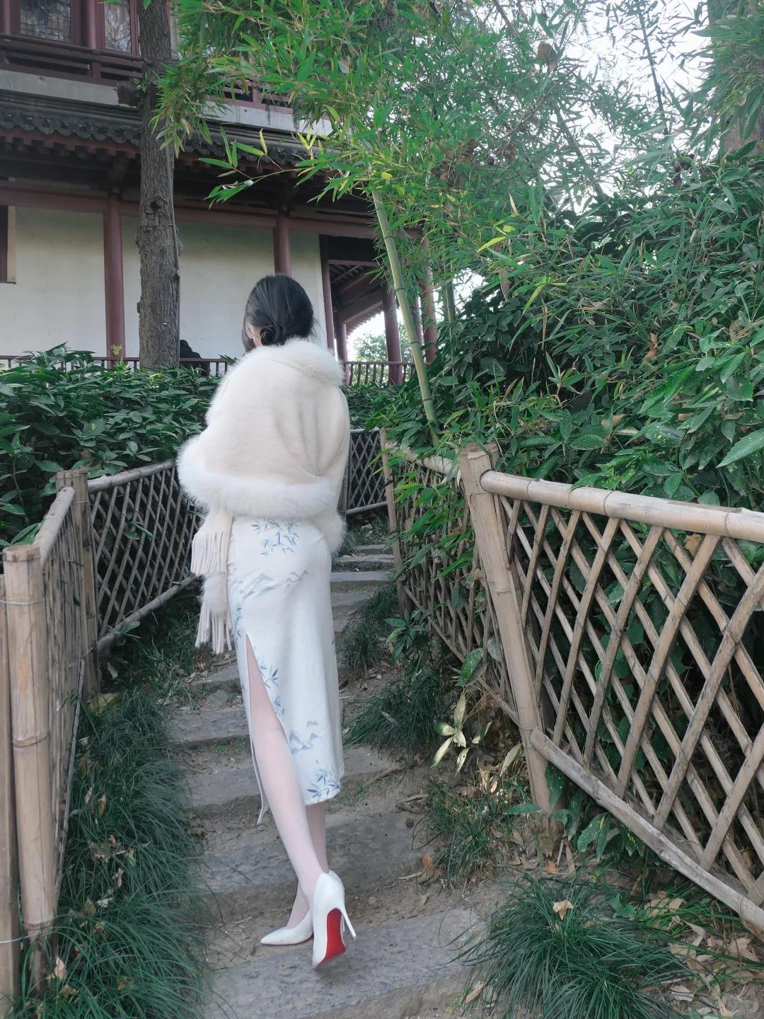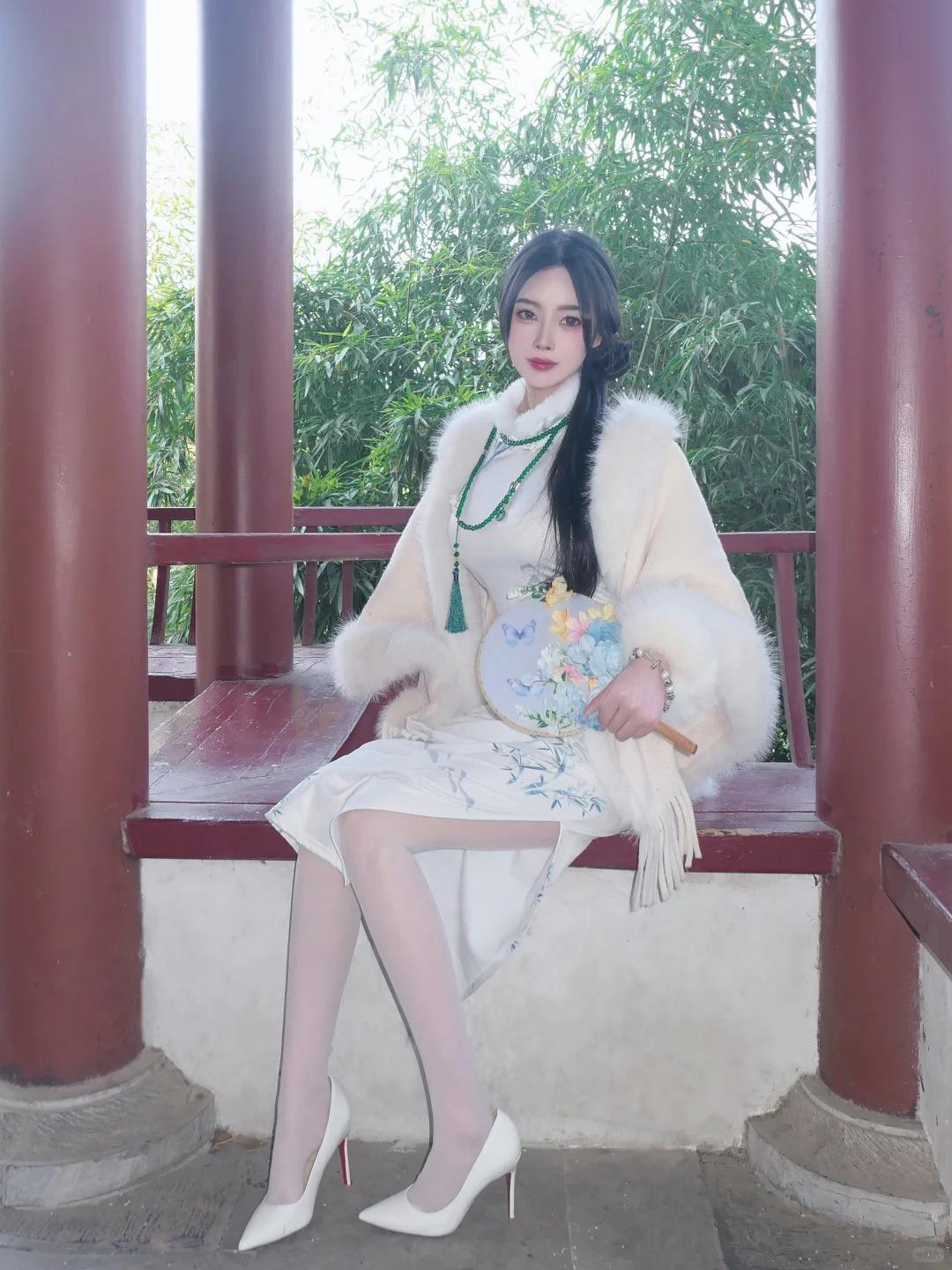 白色旗袍印着淡墨竹纹,清隽雅致藏着东方韵味,柔滑面料衬得身姿愈发温婉。外搭软糯毛毛披肩,中和了旗袍的利落,添了几分慵懒暖意。白丝裹着纤细小腿,通透感拉满,脚下红底高跟鞋一踩,瞬间点亮整套素色穿搭,明艳与温婉撞个满怀。眉眼间的灵动配上这身造型,举手投足皆是风情。果然新中式才是顶流,我的女孩把古典与精致焊在了身上。