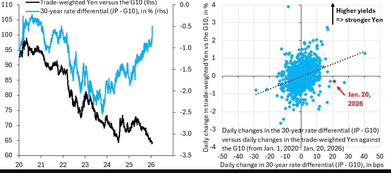 分析:否认债务问题会让日本走向衰败之路 日本日本高市早苗 本文刊发在罗宾·J·布鲁克斯的substack通讯,他是布鲁金斯学会高级研究员,曾任国际金融协会(IIF)首席经济学家。日本将于2月8日举行大选。首相高市正竞选时主张结束“过度”的财政紧缩政策。这种做法极其不负责任。我长期以来一直在提醒,全球正处于债务危机的早期阶段。各国长期国债收益率都已大幅上升。市场正逐渐失去耐心,不再容忍那些长期无法或不愿降低公共债务的政府。为海外华人提供有价值的信息与分析,更多内容和全文可在蓝天、电报、x查找causmoney,或直接谷歌搜索caus.com在这个节骨眼上,假装日本庞大的债务不是问题,根本不是对策。但日本似乎唯一的对策就是否认。几乎可以肯定,日本财务省将出手干预,以提振日元。这不会奏效,因为日本央行仍在大规模印钞买入国债,对日元施加贬值压力。在这种情况下,财务省的干预将毫无成效。更糟的是,这让日本政策看上去极其混乱——央行一边让日元走弱,财务省却试图让日元走强。这一系列否认在昨天达到了高潮。大选消息一出,日本长期国债收益率飙升。上图左侧的蓝线显示日本与其他G10国家之间的30年期利差。黑线是日元相对G10货币的贸易加权指数,两者采用相同权重,可直接对比。右图展示的是同一数据的日度变动,利差变化(横轴)以基点表示,日元变动(纵轴)以百分比表示。昨天最离谱的一点是,尽管日本利率大幅上升,日元却仍然下跌。理论上,利率上升应吸引资本流入,从而推高日元。历史上情况确实如此,正如右图中向上倾斜的趋势线所示。但昨天日元却逆势下跌,说明日本已陷入类似英国2022年那种财政危机状态。值得注意的是,若不是由于格陵兰局势紧张,市场同时抛售美元,日元昨日的跌幅可能更大。因此,日元的“真实”疲软程度实际上远超表面。日本否认债务问题已经根深蒂固。如果收益率继续上升,日本可能将陷入全面债务危机,因此市场会要求日本央行出面限制收益率上行。但这种人为压制收益率的做法,只是把财政风险溢价从债市转移到了汇市。最终受害者就是日元,成了日本否认现实的牺牲品。日本并非没有出路。正如我在近期文章中指出,日本政府拥有大量可出售的金融资产。虽然日本的总债务为GDP的240%,但净债务仅为130%。这些资产并非全都流动性强、可以快速出售,但其中一部分是可以变现的。这正是日本重返财政健康轨道的起点。应出售这部分资产,用所得资金削减债务负担。