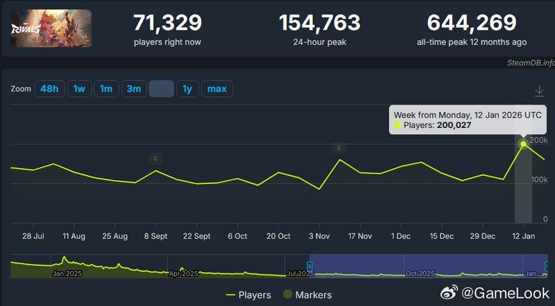 【网易《漫威争锋》Steam重回20万玩家在线!“死侍效应”全面引爆网页链接】随着备受瞩目的漫威人气反英雄“死侍”正式在游戏中登场,网易旗下超级英雄团队PVP射击游戏《漫威争锋》在Steam平台迎来了久违的人气爆发。根据第三方数据平台SteamDB显示的最新统计,1月17日晚间,该游戏的同时在线玩家数量强势突破20万大关。