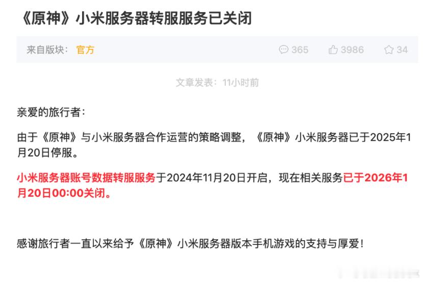 【《原神》小米服务器今天正式停服:首个手机渠道服“熄火”网页链接】1月20日,米哈游发布公告称:《原神》小米服务器账号数据转服服务已经正式关闭,意味着小米和米哈游正式分手。早在2024年11月,《原神》发布公告称,由于与小米服务器合作运营的策略调整,游戏即将停服,并开启了转服服务。2025年1月20日,《原神》小米服务器正式停服,同步关闭小米服的充值入口与新用户注册。如今,随着《原神》小米服务器账号数据转服服务,意味着未完成数据迁移至官服的玩家账号数据将被永久锁定。此次小米服务器关停,GameLook认为可能是《原神》和小米服务器双方合同正常到期所致。