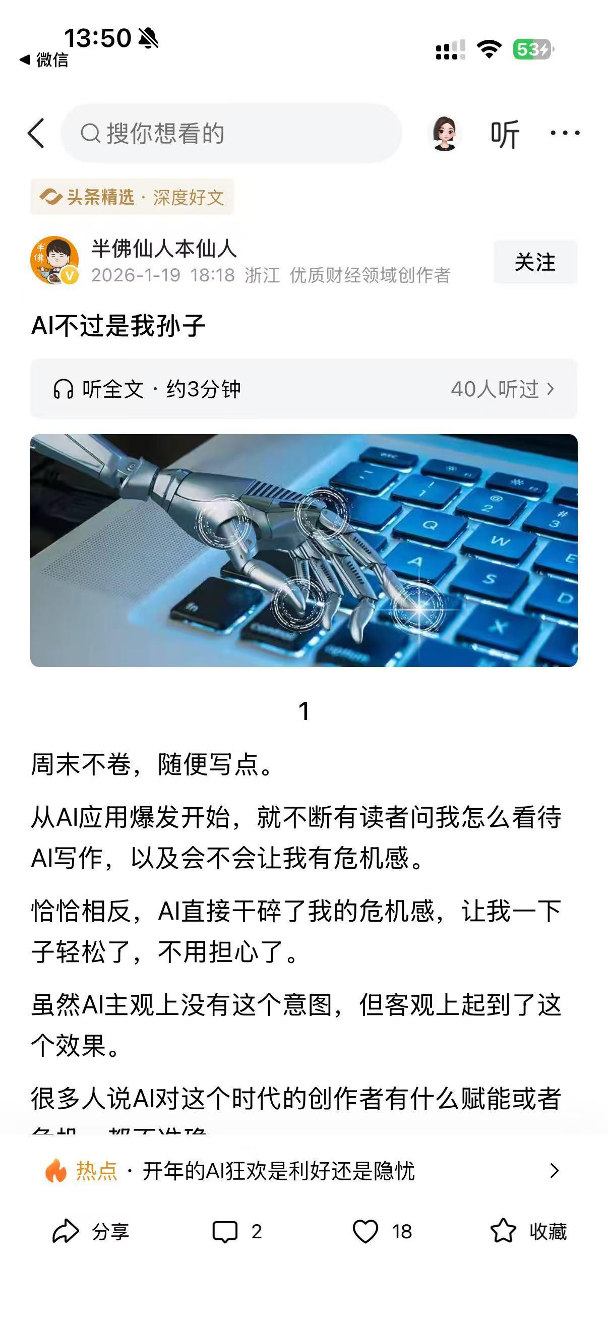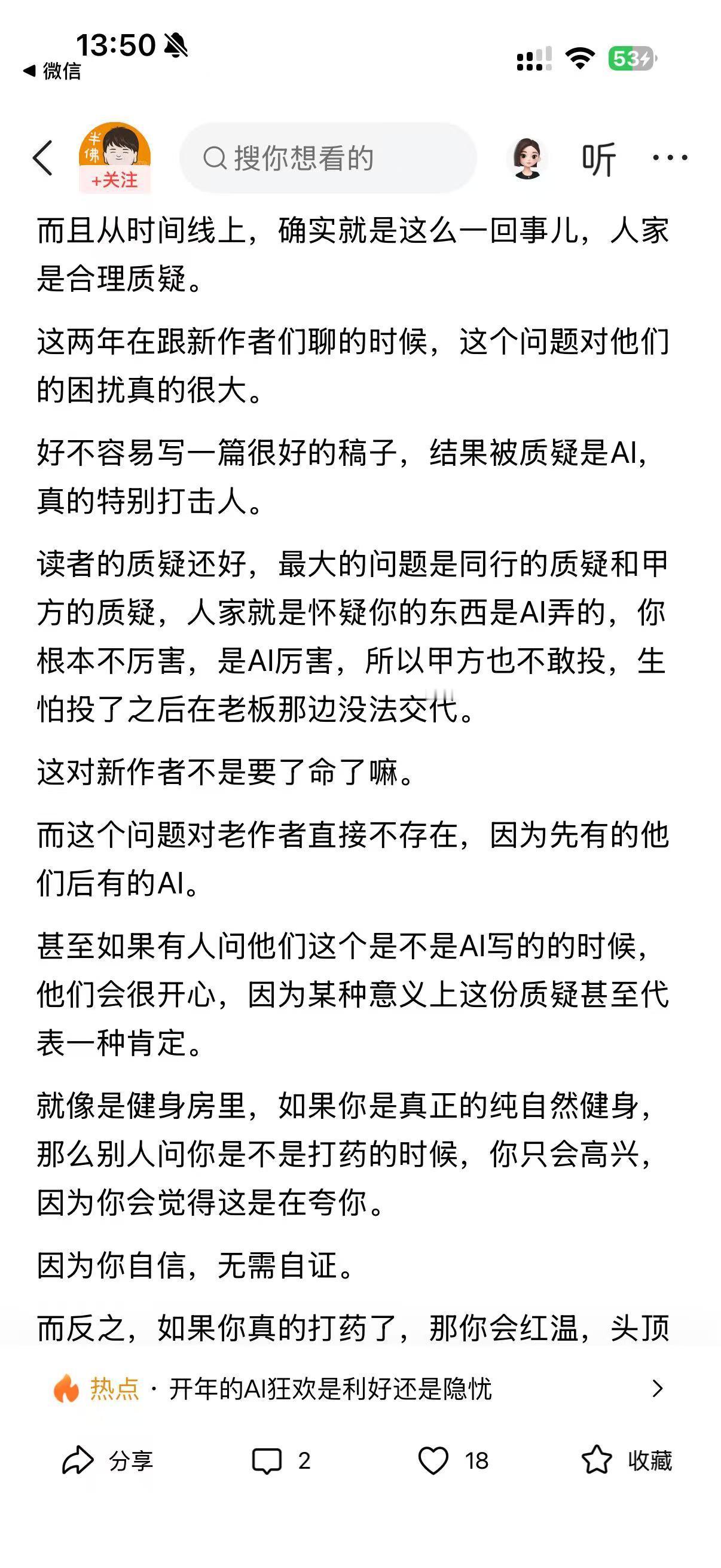 家人们!看到作者说 “AI 不过是我孙子”,真的笑不活了!这心态也太飒了吧,完全颠覆了大家对 AI 冲击创作者的焦虑认知~ 作者直言,AI 不仅没让他有危机感,反而成了 “保护罩”!核心原因特好懂:老创作者在 AI 出现前就证明过自己,根本不用自证 “作品是不是 AI 写的”。有人质疑反而开心,就像自然健身的人被问 “是不是打药了”,纯属变相夸实力! 可新创作者就惨了,刚冒头就面临 “水平自证” 的死局 —— 写得好被怀疑是 AI 功劳,同行、甲方都不敢信,哪怕作品再优秀也难被认可。这种没法解释的质疑,真的太打击人了! 不得不说,作者这视角太独到了!AI 时代,老创作者靠过往履历 “躺赢”,新创作者却要额外闯关。你们身边有没有创作者被质疑过 “作品是 AI 写的”?是不是特别能共情这种无奈?