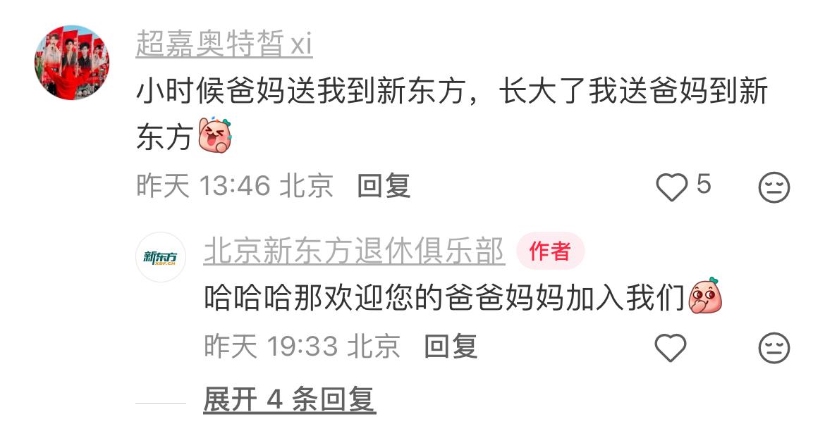 新东方开起“退休俱乐部”了! 昨日,红薯上悄然出现一个名为“北京新东方退休俱乐部”的账号,定位为“北京叔叔阿姨的退休新乐园”。该俱乐部将开设线下社交活动、兴趣课堂、健康养生课程等,专为银发群体打造丰富多元的退休生活。 从少儿英语到留学考试,从职场培训到如今的“银发教育”,新东方可谓覆盖全生命周期,真正实现“一条龙”服务——哪个年龄段都不放过。[抠鼻] 有网友幽默评论:“小时候爸妈送我去新东方,现在我送爸妈去新东方。”[大笑]