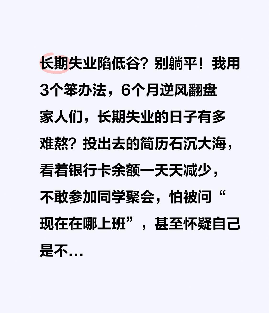 长期失业陷低谷?别躺平!我用3个笨办法,6个月逆风翻盘 家人们,长期失业的日子有多难熬?投出去的简历石沉大海,看着银行卡余额一天天减少,不敢参加同学聚会,怕被问“现在在哪上班”,甚至怀疑自己是不是一无是处!我曾经失业8个月,从自信满满到自我否定,差点就垮了!今天把走出低谷的真实经历分享给你,句句都是血泪总结,帮你少走弯路! 刚失业的前3个月,我还保持着上班的作息,每天雷打不动投10份简历,可回应寥寥。后来慢慢懈怠了,每天睡到中午才起,抱着手机刷短视频麻痹自己,饭都懒得做,靠外卖和泡面度日。家人劝我“先找份工作过渡”,我却觉得“大材小用”,总想着找个和以前薪资相当的岗位,结果越等越焦虑,甚至不敢接朋友的电话。 转折点来了! 那天我妈来看我,看着乱糟糟的出租屋和憔悴的我,红着眼眶说:“孩子,工作没了可以再找,志气不能丢啊!” 看着妈妈花白的头发,我突然扇了自己一巴掌:我不能再这样浑浑噩噩下去了!当天晚上,我就做了第一件事——打破摆烂状态,重建生活秩序! 我给自己制定了严格的作息:早上7点起床,跑步半小时,然后洗漱、做饭;上午9点到11点,研究招聘信息、优化简历;下午1点到3点,学习新技能;晚上6点到8点,出去摆地摊赚零花钱。一开始很难坚持,总想偷懒,但每次想放弃,就想想妈妈的话,硬生生扛了下来。规律的生活让我慢慢找回了状态,不再焦虑迷茫。 第二件事,放低姿态,先赚“救命钱”! 我以前是做设计的,失业后就接一些兼职设计的活,一单几百块;晚上去夜市摆摊卖小饰品,一晚上能赚200多。有人认出我“以前的设计师”,嘲笑我“混得这么惨”,我笑着回:“靠自己双手挣钱,不丢人!” 虽然赚得不多,但至少能养活自己,不用靠家人接济,这种踏实感比什么都重要。 第三件事,深耕技能,等待机会! 我知道,长期失业后,想要重返职场,必须提升自己的竞争力。我利用白天的时间,在网上学习新媒体设计、短视频剪辑,还考了相关的证书。为了积累案例,我主动给一些自媒体账号免费做设计,慢慢的,我的作品集越来越丰富。 皇天不负有心人,在失业的第6个月,我凭借扎实的技能和丰富的案例,成功入职了一家新媒体公司,薪资比以前还高!回头看那段日子,虽然苦,但也让我明白:长期失业不可怕,可怕的是你失去了重新开始的勇气。 其实人生就像爬山,总有上坡和下坡。低谷期不是终点,而是让你沉淀自己、积蓄力量的起点。只要你不放弃,肯努力、肯弯腰、肯学习,就一定能走出困境! 你现在处于失业低谷期吗?有没有想过怎么改变?评论区聊聊,我们一起加油!点赞关注,下期分享优化简历的5个实用技巧,帮你快速拿到面试offer!