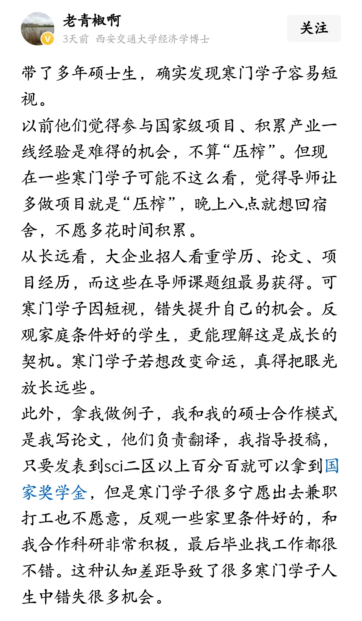 带了多年硕士生,发现寒门学子容易短视,错失人生很多机会。
