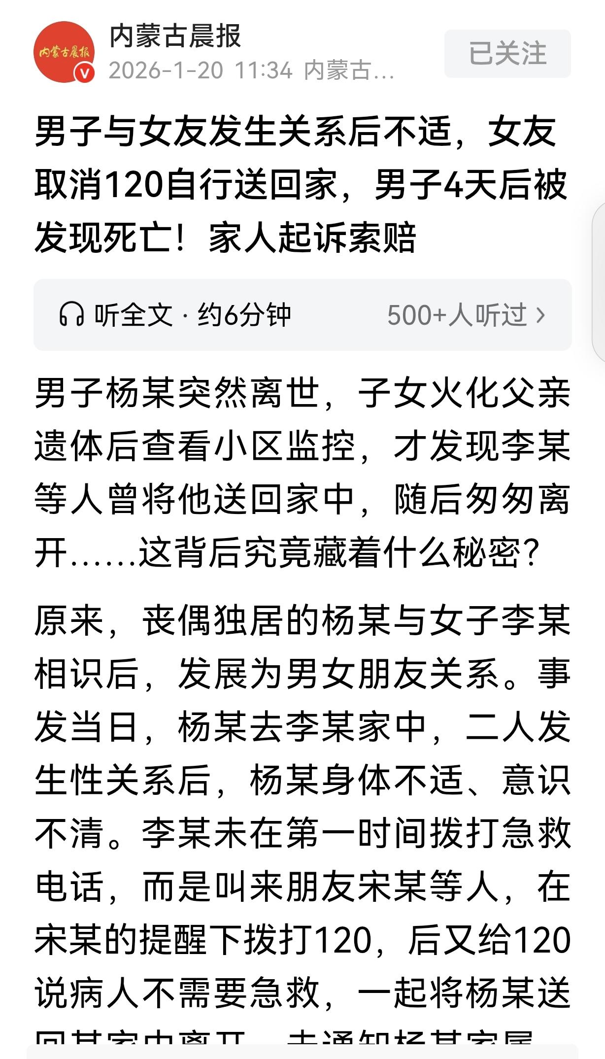 “这就是放纵的后果!”山西太原,一丧偶男子去女子家约会,两人完事后,男子感觉身体不适,随后晕了过去,女子没拨打120,竟然叫来4个朋友,朋友一看男子挺严重,让女子赶紧打120,可女子打完后怕花钱更怕惹麻烦,竟然和4个朋友,一起把男子送回家,4天后,男子的儿女发现他死在家里,火化后,一查小区监控,发现女子见死不救,直接把女子5人告上法庭,索赔31万。 杨某丧偶后,感觉生活非常孤独,有了再婚的想法,他认识了女子李某,两个人看对眼了,就处起对象。 2023年5月7日上午,杨某又想李某了,直接去了她家,两人一番肌肤之亲,杨某突然感觉身体不得劲,很快意识也不清了。 按理说,李某应该立马打120,把杨某送去医院,但她可能怕花钱,也怕惹麻烦,竟然叫来朋友宋某,想把杨某送回家,这样自己就不用担责任了。 宋某来了后,发现杨某陷入昏迷,觉得事情很严重,让李某赶紧打120,千万别耽误,否则后果不堪设想。 李某一听害怕了,直接打了120,随后120给李某打来电话,让她不要动杨某,救护车很快就到。 也不知道李某怎么想的,竟然改变了想法,又给120打去电话,谎称杨某醒了,不需要救治了,直接把救护车给打发回去了。 然后,李某决定还是不找麻烦了,直接把杨某送回家,让他自生自灭吧,可仅凭她和宋某2个人,根本搬不动人高马大的杨某,她又给李某丙打去电话,把他叫过来帮忙。 李某丙爽快的答应了,可他觉得李某是个女人,也没力气,他和宋某两人想把杨某送回家,也吃力,就又把朋友樊某和张某叫来帮忙。 张某开车过来了,他又出人又出车,但没下车帮着抬杨某,李某还有李某丙、樊某、宋某一起把杨某抬下楼,由张某开车把他送回了家,然后5个人扬长而去。 可怜的杨某,就这样被5人见死不救,4天后,被4个儿女发现死在了床上。 4个儿女以为杨某属于猝死,火化后,他们还是觉得蹊跷,一查小区监控,顿时大惊失色。 儿女们发现李某等5人把昏迷不醒的杨某送回家,扔下不管,否则父亲也不可能死,他们一怒之下直接报了警。 但检察院认为,目前的证据不能证明李某的不作为,和杨某死亡有因果关系,决定不起诉。 杨某的4个儿女不服,把李某等5人告上法庭,索赔31万,并赔礼道歉。 杨某丧偶后想找个伴儿,和李某处上对象,结果约会时突然身体不适晕过去,这李某的操作简直让人目瞪口呆! 按说,人晕过去了,第一反应肯定是赶紧打120送医院啊,这可是救命的事儿! 可李某呢,怕花钱怕惹麻烦,先是叫朋友来想把杨某送回家,想一走了之逃避责任。 朋友宋某还算有点良心,看出情况严重,让她赶紧打120,她这才打了。可120都准备来了,她又反悔,谎称杨某醒了不需要救治,把救护车打发走,这操作简直是拿人命当儿戏! 后来,她还是不死心,叫来4个朋友,把昏迷的杨某送回家,扔下不管。 这5个人,就这么眼睁睁看着一个活生生的人被送回去等死,良心不会痛吗? 杨某的儿女发现父亲死在床上,一查监控,气得要命,直接报警。可检察院觉得证据不足,没起诉,儿女们不服,又告上法庭索赔31万。 这事儿说到底,就是李某等人太冷漠、太自私了!怕花钱怕麻烦,就能对一条人命不管不顾吗? 就算不是法律上的直接责任,道德上也过不去啊!杨某好歹和她处过对象,就算没有感情,基本的同情心总该有吧? 现在法律讲究证据,可能确实没法直接证明李某的不作为和杨某死亡有直接因果关系,但这事儿在情理上,绝对说不过去!杨某的儿女要个说法、要个赔偿,也是人之常情。 《民法典》第1005条规定:自然人的生命权、身体权、健康权受到侵害或者处于其他危难情形的,负有法定救助义务的组织或者个人应当及时施救。 杨某在李某家中突发昏迷,处于“危难情形”,李某作为现场唯一具备行为能力且与杨某有密切关系的人,负有法定的救助义务。 她本应立即拨打120或采取必要救助措施,但李某因“怕花钱、怕惹麻烦”拒绝施救,甚至欺骗120取消救援,直接违反第1005条的核心要求。 李某不仅未履行救助义务,反而伙同他人将昏迷的杨某转移至无人照看的家中,导致杨某完全丧失获救机会。 这种主动转移危难者的行为,客观上切断了杨某与外界的救助联系,属于对危难情形的进一步放任。 宋某、李某丙等4人虽无直接法定救助义务,但在明知杨某昏迷需急救的情况下,仍协助李某实施转移行为,实质上参与了制造风险的过程。 根据《民法典》第1168条,五人因共同过错导致杨某处于更危险境地,构成共同侵权。 尽管检察院认为“无法证明不作为与死亡有直接因果关系”,但民事赔偿采用“相当因果关系”标准。 如果李某等人及时送医,杨某有较高生存概率,其拒绝救助和转移行为显著提高了死亡风险,应认定存在法律上的因果关系。 最终,法院判决李某赔偿杨某4儿女精神抚慰金40000元,其他4人各赔偿2500元。 关注@灋律盐究员