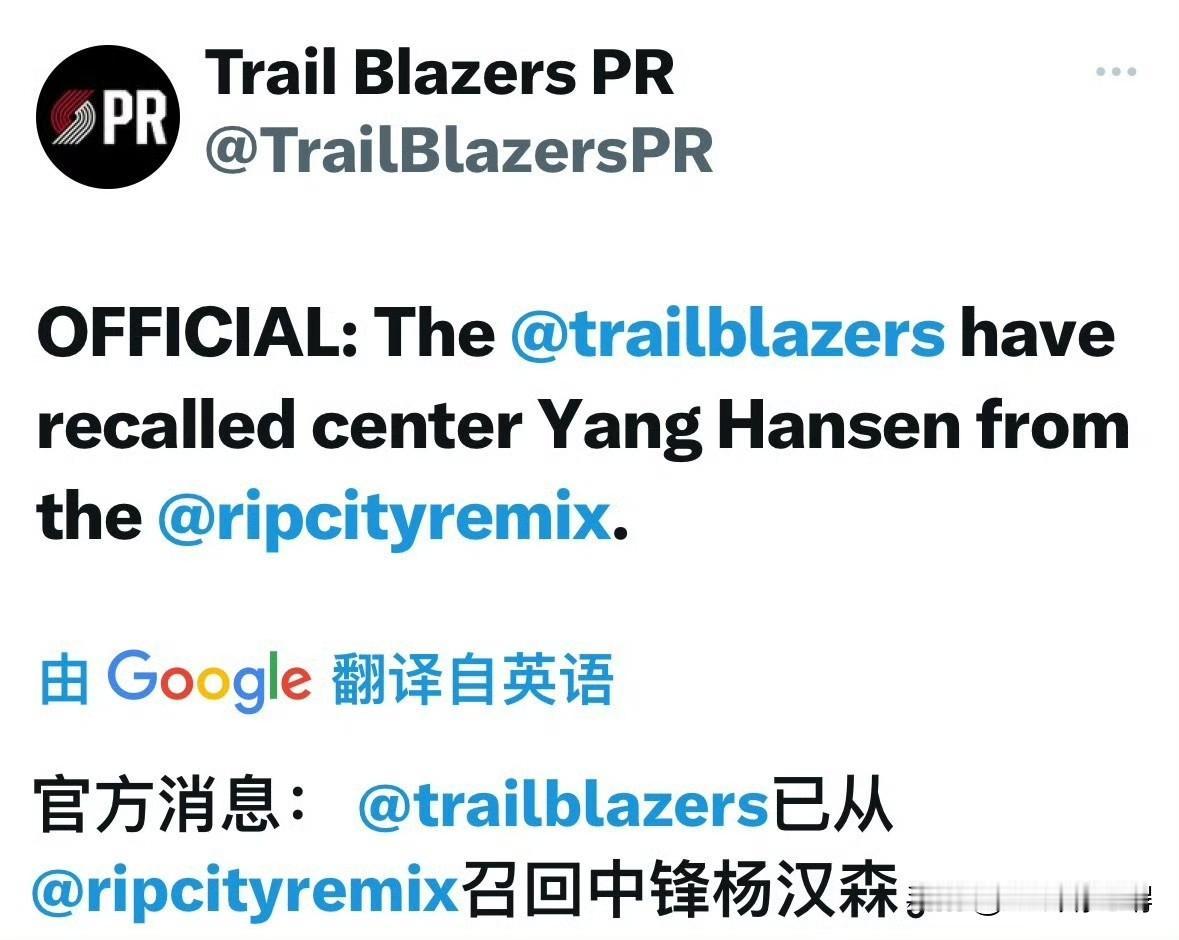 有希望?开拓者在今天凌晨宣布球队已经从发展联盟召回了中国球员杨瀚森,估计球队也是评估了小杨这7天以来参加的6场比赛综合情况,后续随着整个赛季后半段杨瀚森几乎是不会再打发展联盟的比赛了,毕竟在发展联盟作为一个足尺寸的大中锋,得分和防守实在是没有难度。 现在对于小杨来说头等大事还是要尽快的提升自己的英语水平,特别是在场上与队友的沟通方面,好几场比赛他在内线喊位补防,队友完全听不懂,要知道在防守环节中锋对于整个防守阵型至关重要。 作为新秀,而且还是在一个为了争夺季后赛附加赛名额的球队,势必不会得到太多的出场机会,上场做好防守才能逐渐获得主教练的信任,在此前对阵灰熊时斯普利特就重点表扬了杨瀚森对于扎克的防守,足以见得教练组对于防守的重视程度。 套用一句经典的话:敢问路在何方,路在脚下,小杨真的要自己加倍努力啊!
