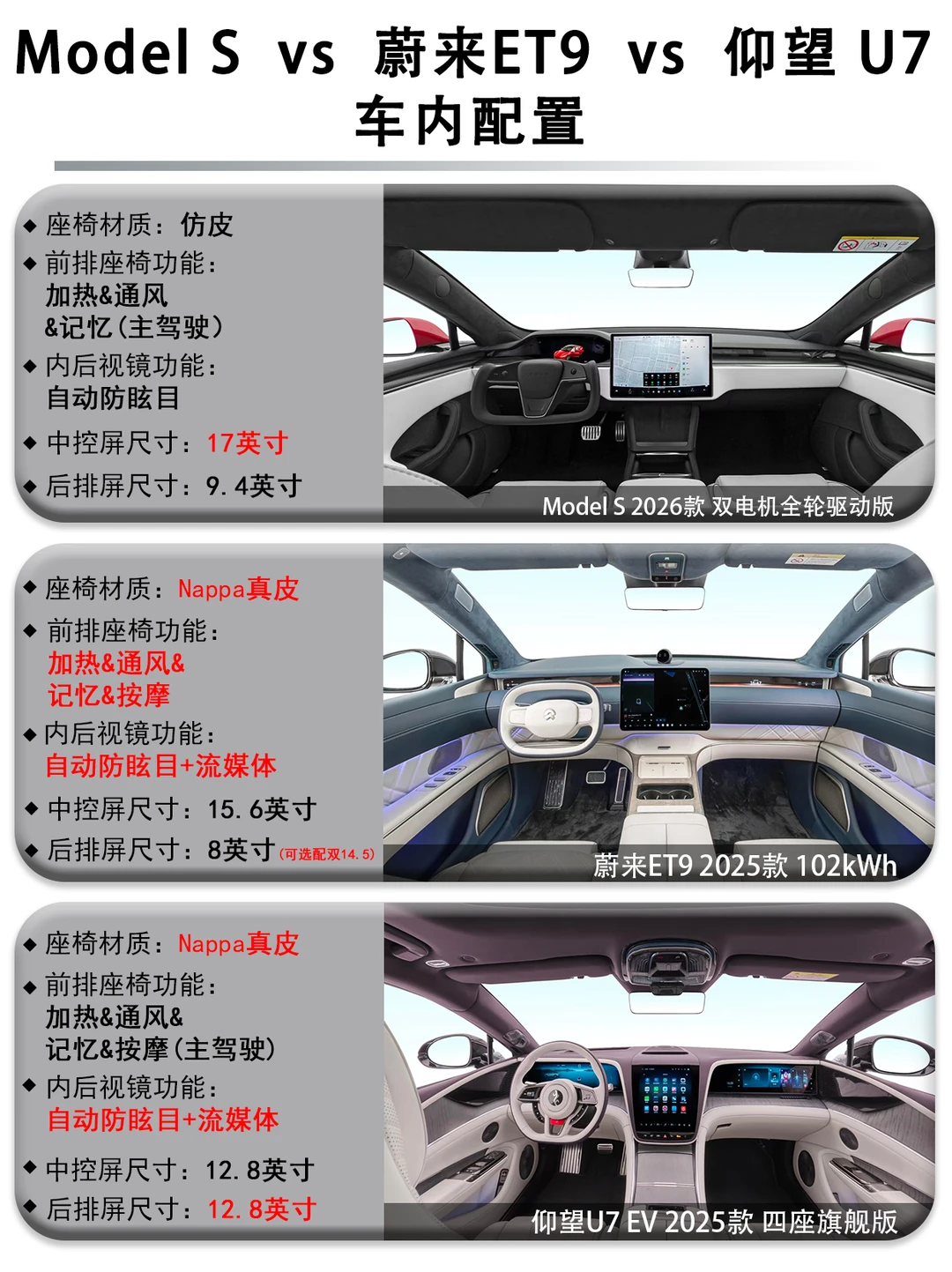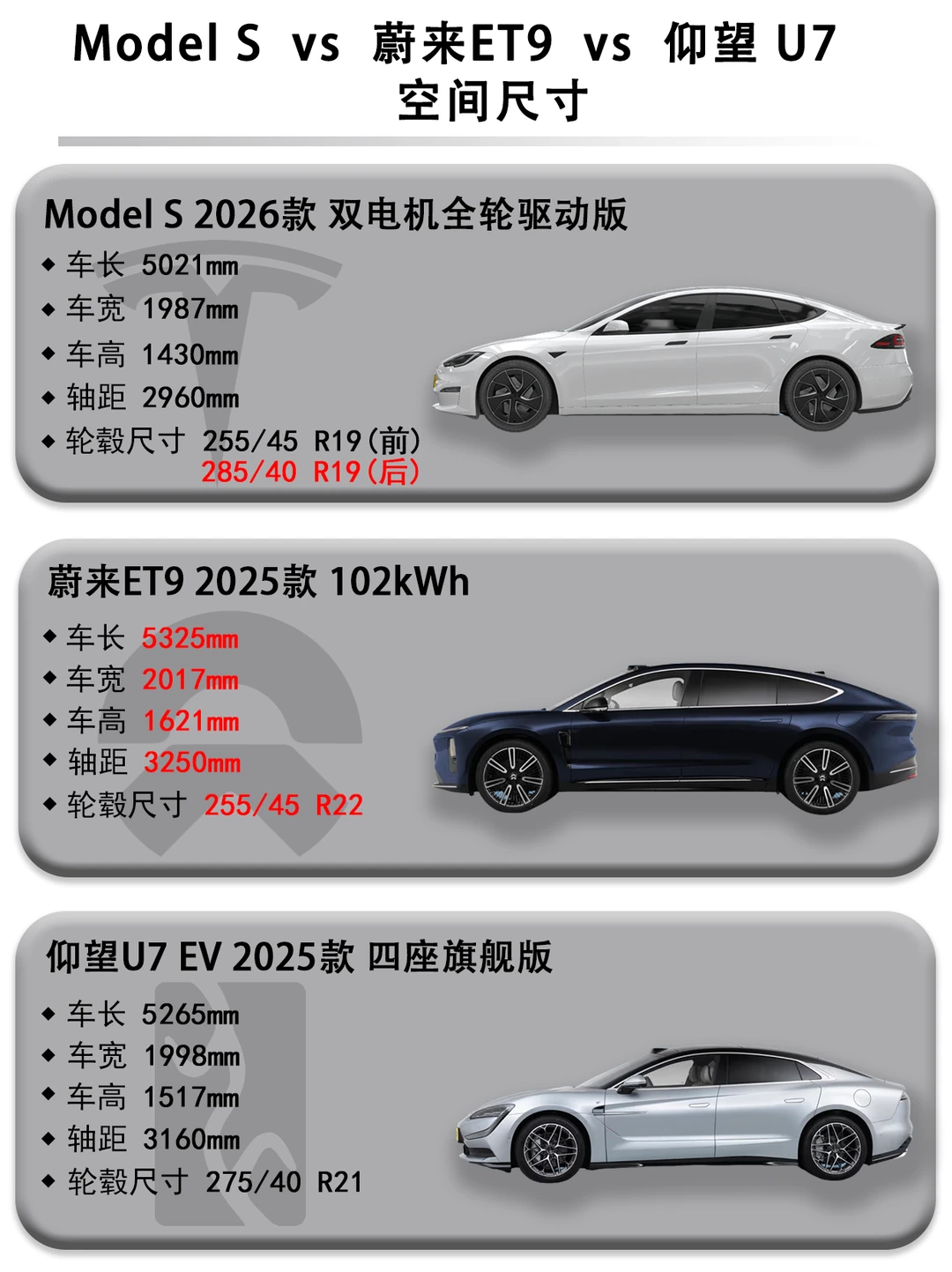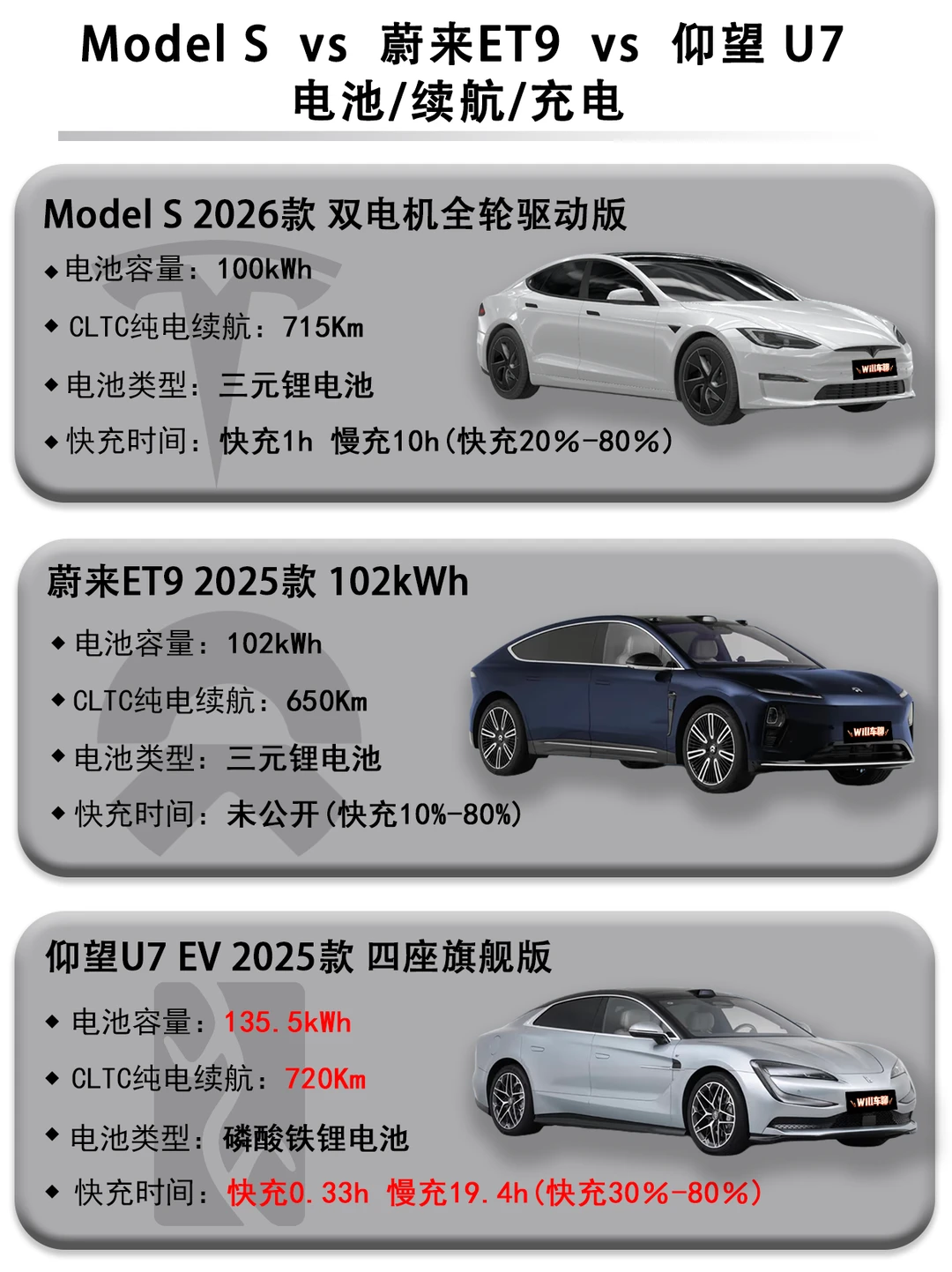 手握80万预算,想买一台既豪华又智能还能打的全能电车?今天直接拉出三台顶流选手——特斯拉Model S 2026款 双电机全轮驱动版(以下车型简称Model S)、蔚来ET9 2025款 102kWh(以下车型简称蔚来ET9)、仰望U7 EV 2025款 四座旗舰版(以下车型简称仰望U7),一篇帮你穿透参数迷雾,锁定你的本命座驾!