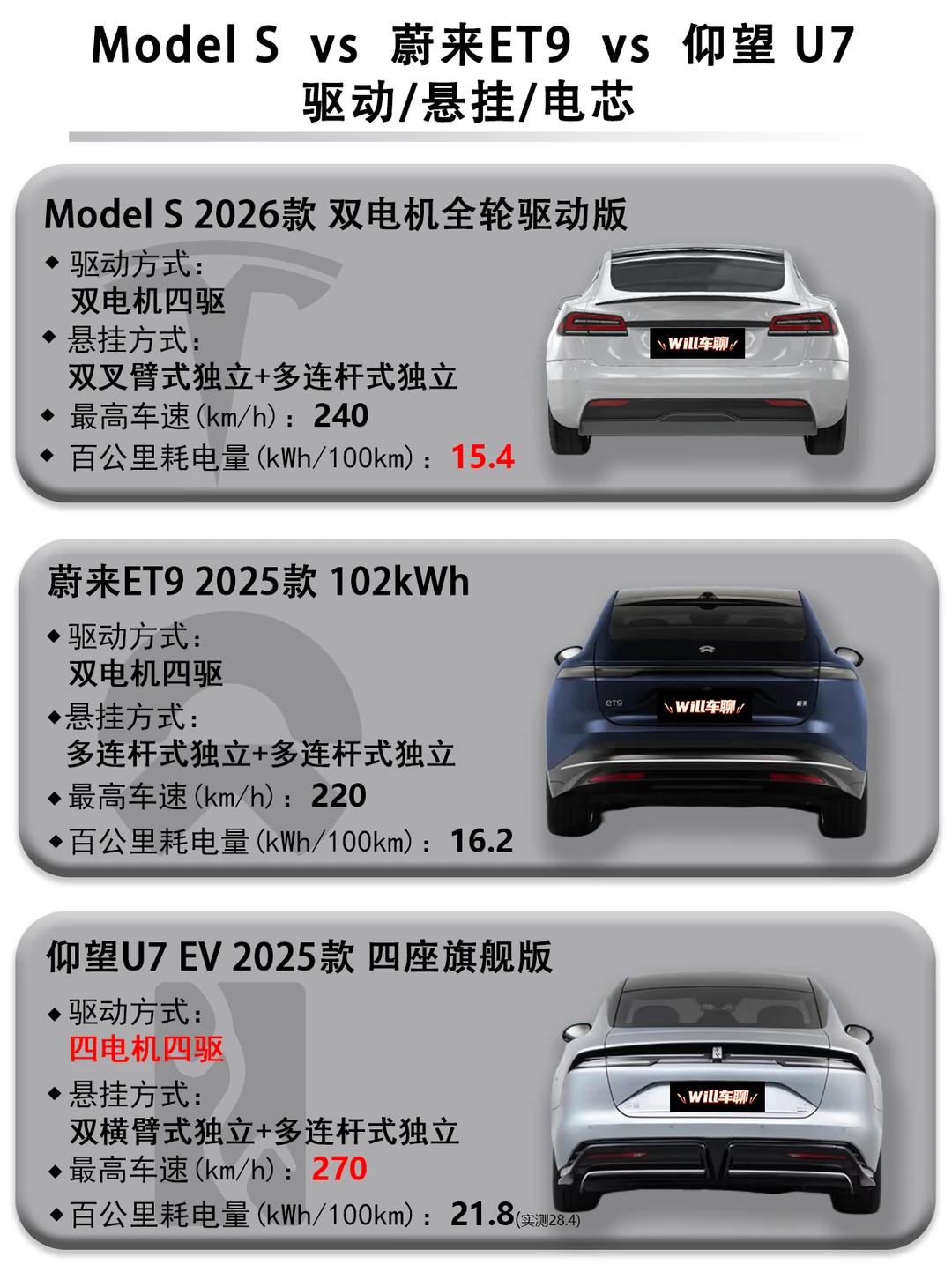 Model S:双电机四驱,性能强悍,操控精准,悬挂为双叉臂+多连杆,百公里加速3.2s,最高车速240km/h,百公里耗电15.4kwh