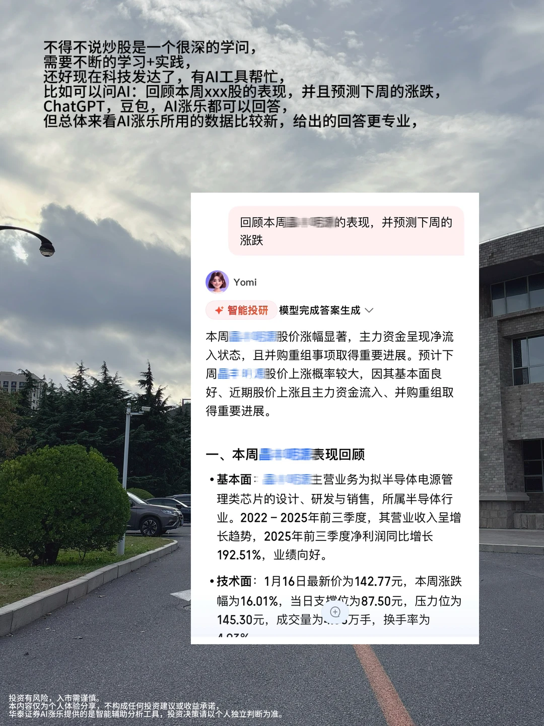 比如可以问AI:回顾本周xxx股的表现,并且预测下周的涨跌,