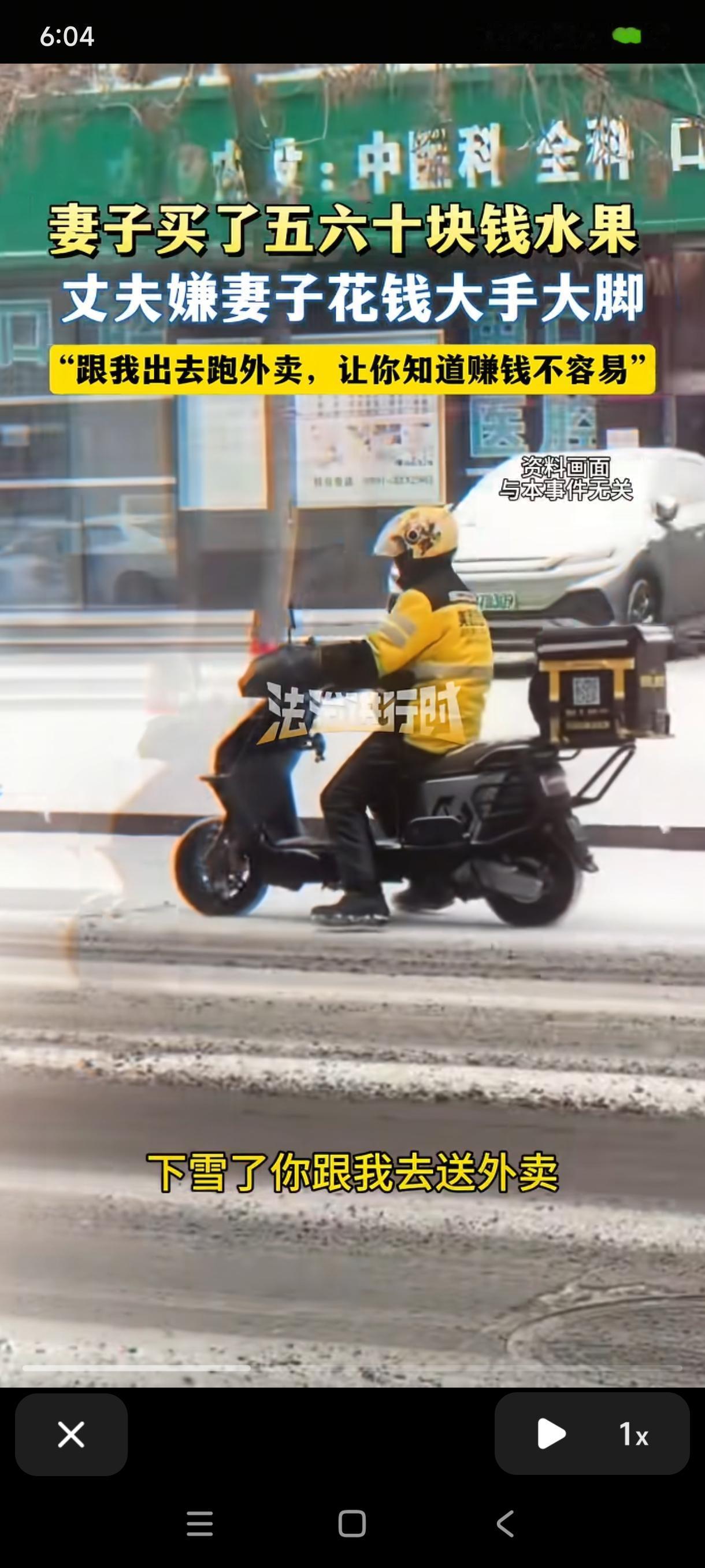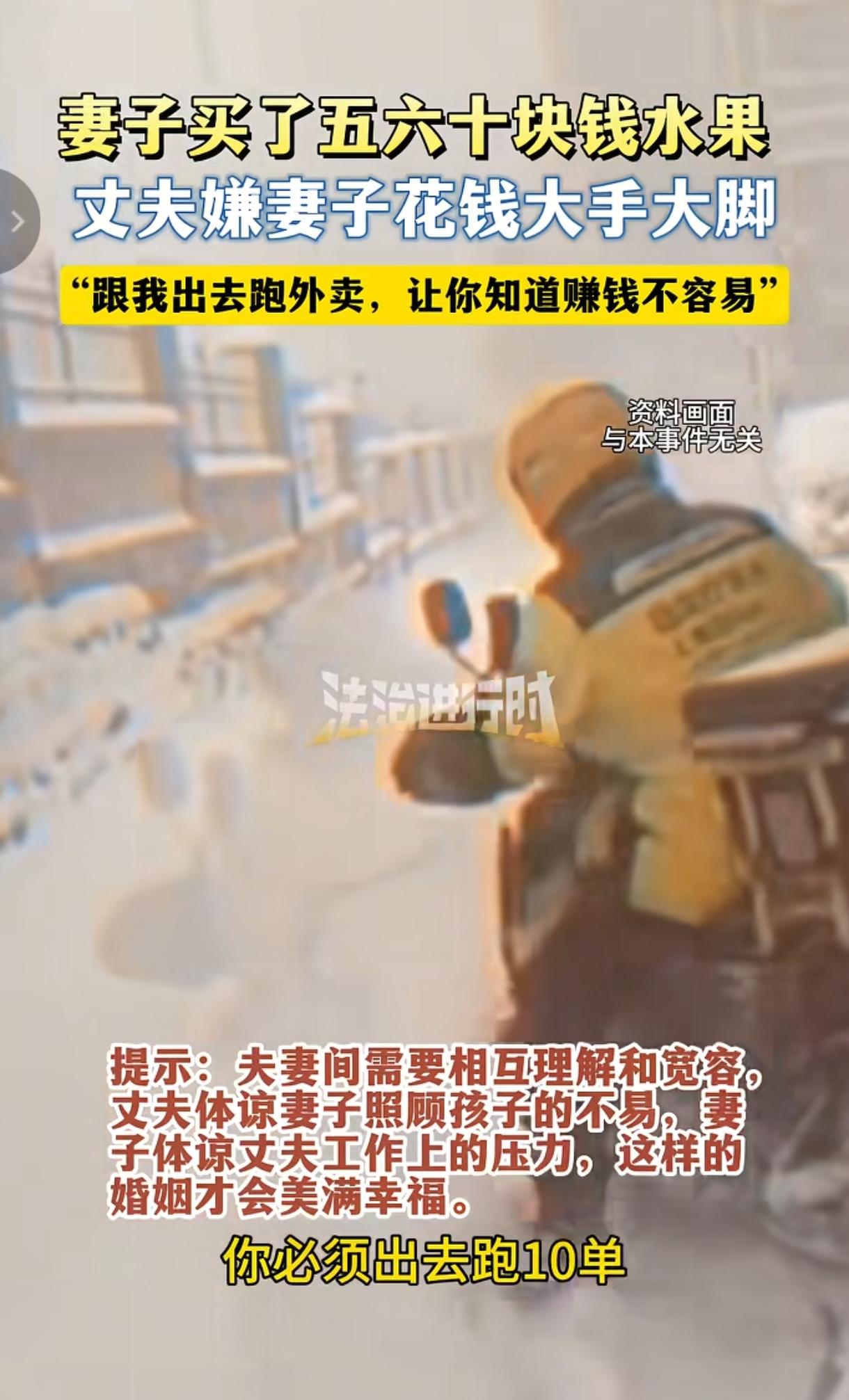 “太无语了!”湖北,妻子买60元水果回家,丈夫一看十分生气,指责妻子花钱大手大脚,甚至上纲上线:“下雪了,你跟我出去送外卖,一单15元,你必须跑4单把它挣回来,这下你就知道赚钱有多不容易了,就知道花!”网友:听他说那一刻我震惊了,这么理直气壮! (来源:法治进行时) 视频里,地板上放着两篮水果,貌似一篮是菠萝蜜,一篮是莲雾还是苹果,看不清楚。没想到就是妻子买回来的这两篮水果竟然引发丈夫的极大不满与强烈指责。 身为快递员的丈夫,用手指指着地上的这两筐“罪证”,怒不可遏地拍着视频控诉道:“看,就买那一点水果,又花了五六十啊。” 一个“又”字可见男子已经是忍了不下一次了,这一次他是铁了心地直接拍下了视频,难道这是要表明这是人证、物证俱在吗? 之后男子开始指责妻子并上纲上线:“下雪了,你就跟我一起去送外卖,一单15元,你必须把它搞回来!必须跟着我出去跑4单,这是教你知道赚钱有多不容易,就知道花!” 丈夫意思是让妻子跟自己冒雪出去跑外卖挣回买水果花去的钱,还说这是教妻子认识到赚钱有多么不容易。 不知道这视频是男子自己发出来的,还是别人发出来的,如果是男子发出来的就总感觉是在网暴自己呢。 网友们看到这一幕,纷纷热议不止,尤其女同胞们更是义愤填膺~~ 有网友说:我花多少老公从来没说过,说我想吃啥买啥,有喜欢的衣服就买,还说这些不用省。 也有网友说,爱不爱都在细节里,爱你的人他赚一百可以全部拿给你,不爱你的人他赚一万你花一百都嫌你花得多。 也有网友说,其实五六十块钱真心也买不了多少水果,就算最普通的水果苹果也要好几块钱一个,真的不必上纲上线。 还有网友说,不是说不该买,是现在物价太高了,工资又太低了,钱真的太难赚了,个人觉得还是该省则省吧。 还有网友说,女人也真不容易,买水果也许是小孩想吃,也许是公婆或老公爱吃才买,但若是条件有限,还是理性消费。 常言,贫贱夫妻百事哀。这一事件彰显了底层家庭在生存压力下的消费观念、情绪宣泄以及有效沟通缺乏所产生的矛盾。 外卖员挣钱辛苦十分不易,这令他对家庭的每一笔开支都十分敏感,但其实他的计较里藏着赚钱的焦虑,或并非对妻子的苛责。 当然用罚跑外卖让妻子意识到错误,这是大为不妥的,妻子买水果或是为平淡日子添一点甜却不被丈夫理解,这也令她很失望。 其实,平常夫妻之间的相处之道是“我知道你辛苦,你也懂我偶尔的小期待”,互相守住对彼此的理解,以不让生活压力吞噬掉生活里的温柔。 其实偶尔买一些贵点的水果无可厚非,只要不是经常买,我觉得还是可以的。当然妻子也要理解丈夫挣钱的辛苦,理性消费,如此才能把家庭经营幸福。 对于这件事,大家怎么看呢?