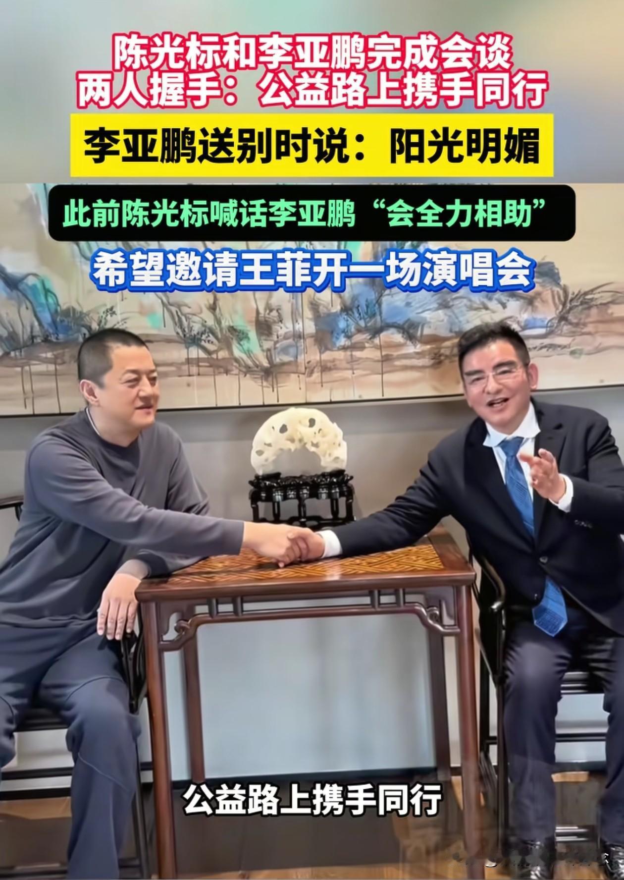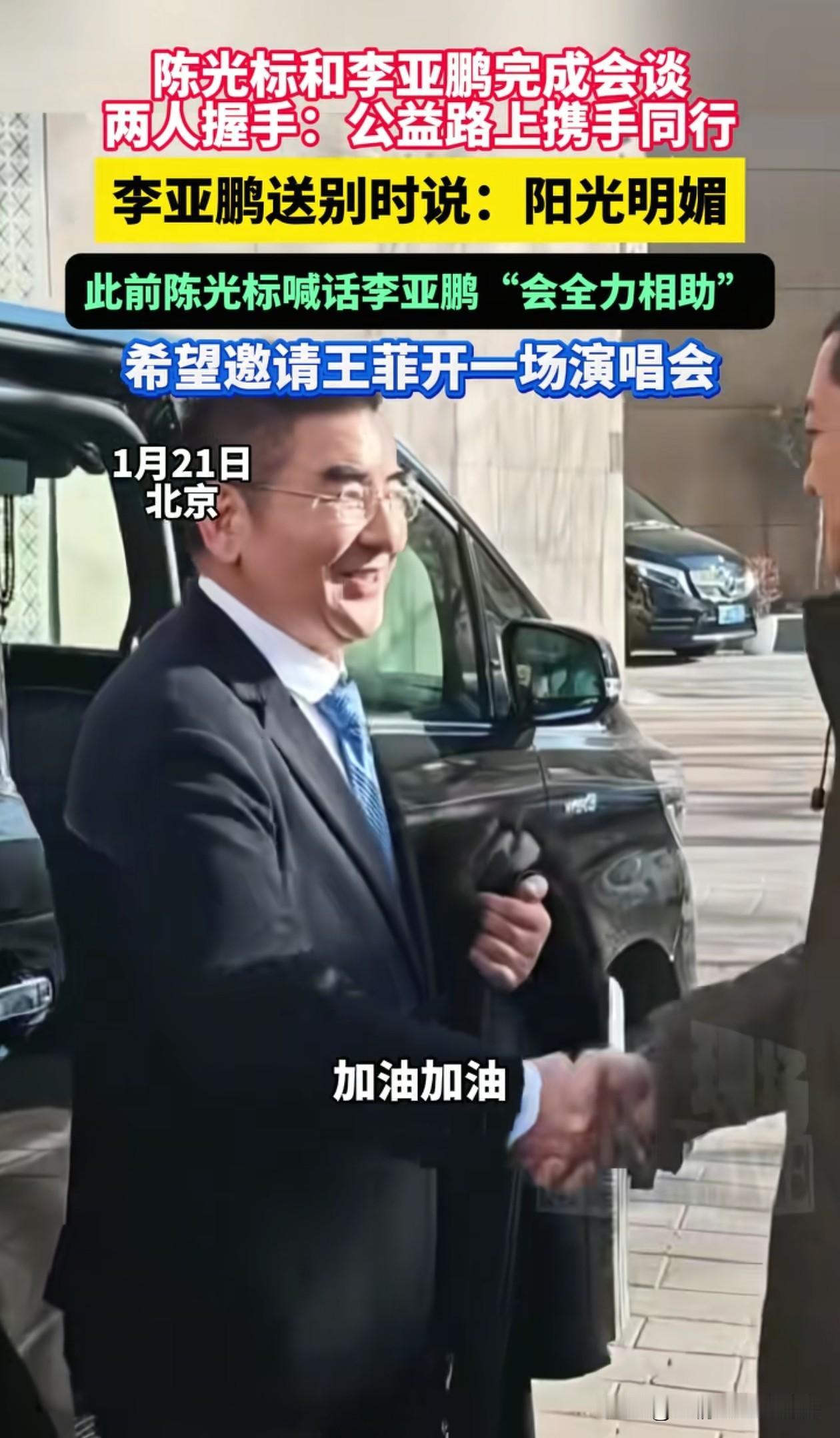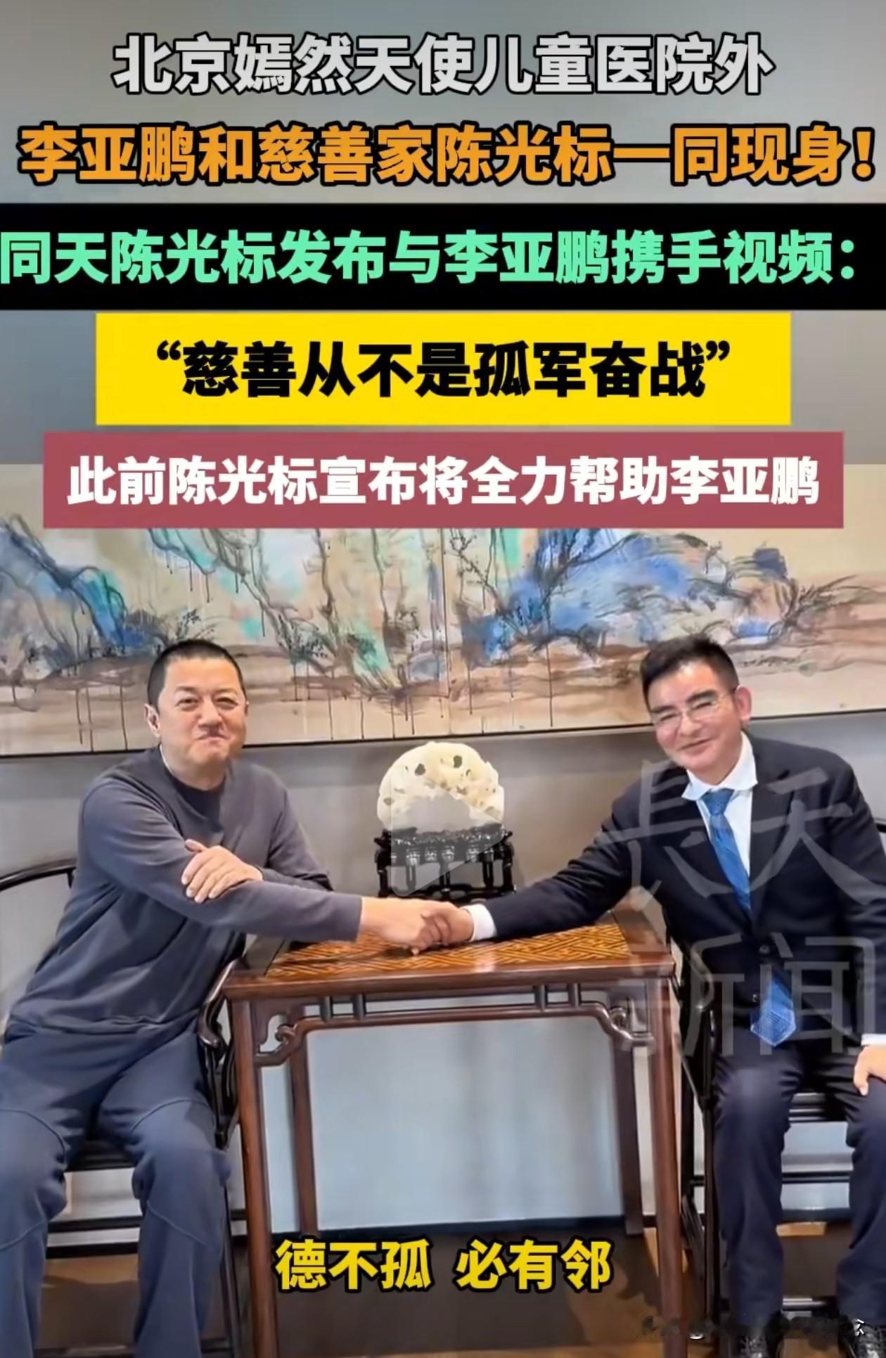 李亚鹏和陈光标一同现身嫣然儿童医院,记者问李亚鹏,今天心情怎么样?李亚鹏难掩笑容,回答:“阳光明媚!” 李亚鹏和陈光标估计已经达成了某种合作方案,李亚鹏在医院外和陈光标握手道别,还一起录制视频,陈光标说:“公益路上携手同行”,李亚鹏说“德不孤,必有邻。” 这一刻,我们这些隔着屏幕为嫣然揪心、为李亚鹏鼓劲的人,都忍不住心头滚烫。期待有好消息!
