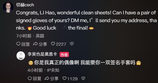 切赫评论要李昊签名手套【偶像来了!切赫评论要李昊签名手套,李昊回复:你是我真正的偶像】李昊对切赫说你是我真正的偶像 直播吧01月21日讯 U23亚洲杯半决赛,中国男足U23战胜越南U23晋级决赛。李昊本届U23亚洲杯发挥出色,此前在接受央视采访时表示很喜欢切尔西和切赫。切赫今日现身李昊社媒评论区写道:“祝贺你李昊,精彩的零封!可以给我一双你的签名手套吗?私聊我,我会给你我的地址,谢谢,决赛好运!”李昊之后回复切赫:你是我真正的偶像啊 我能要你一双签名手套吗