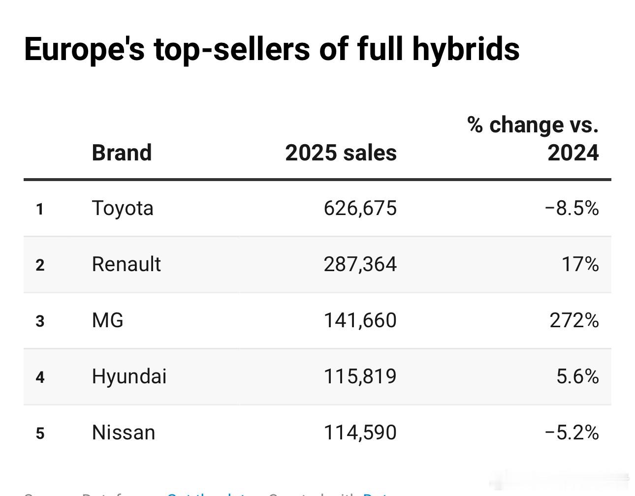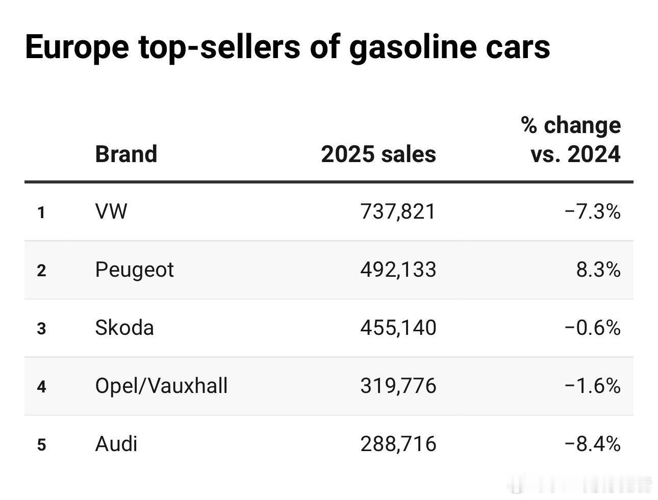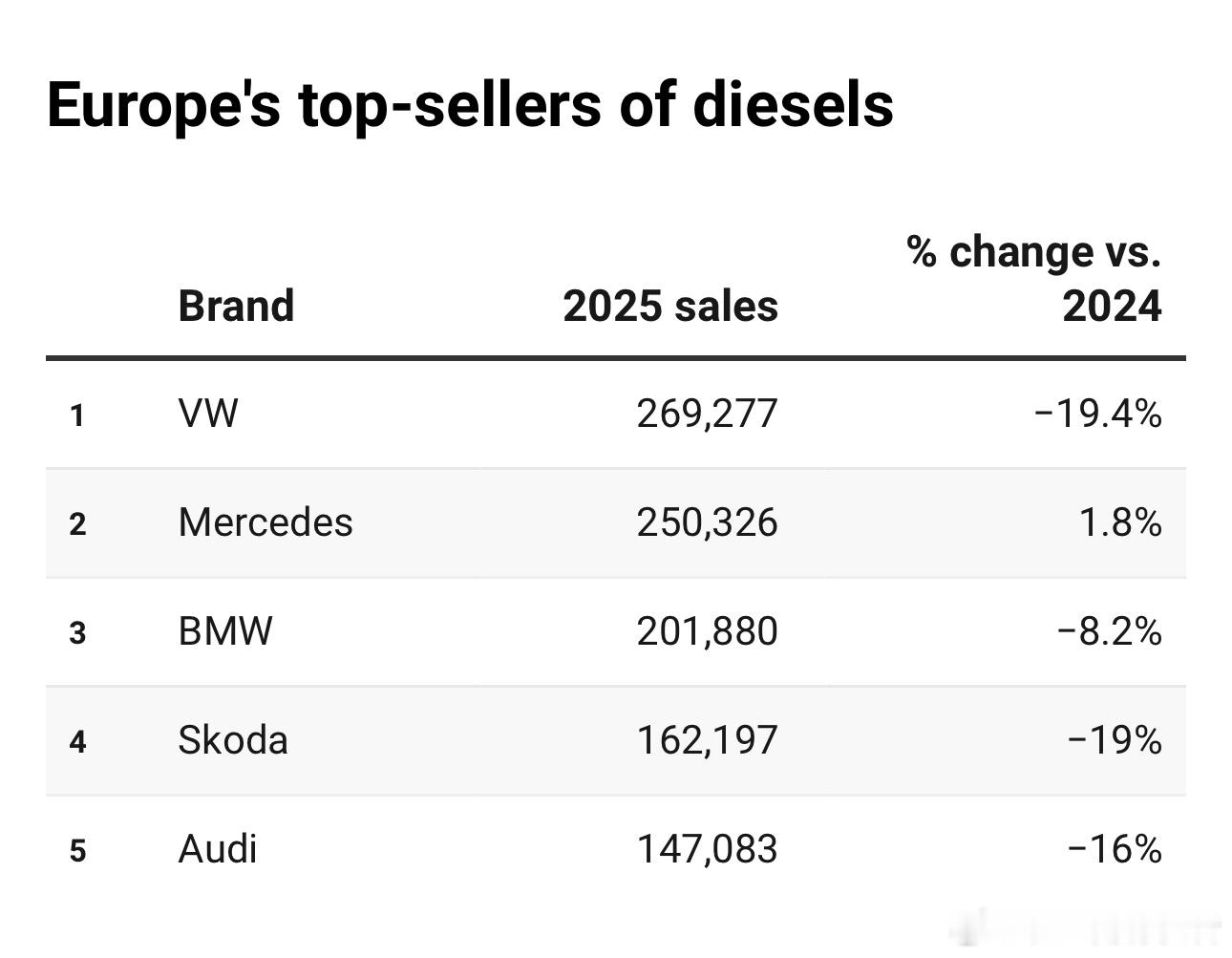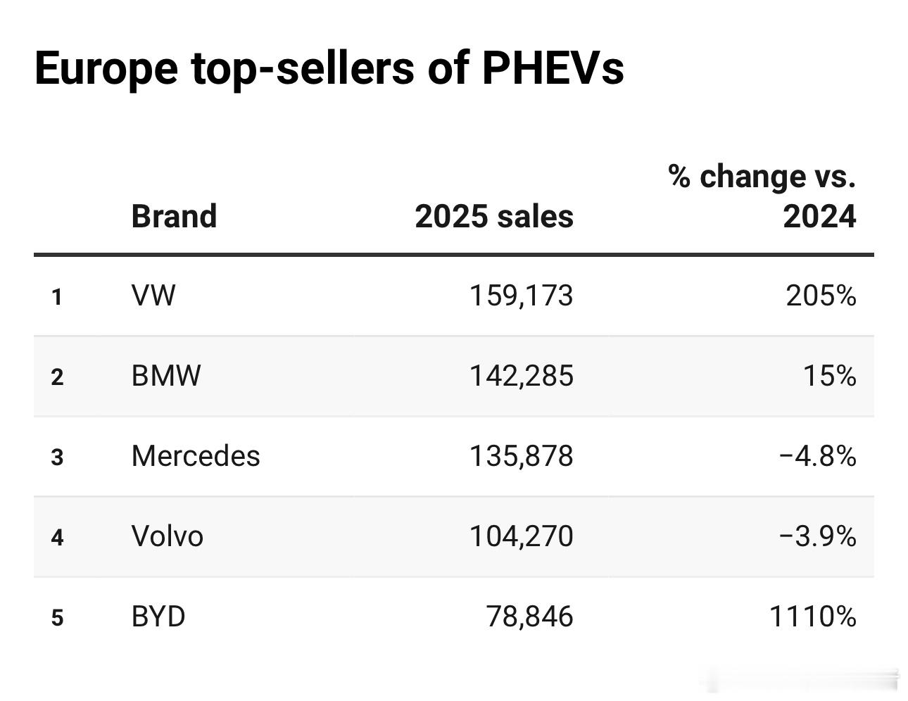 回看2025年欧洲市场的销量,大众,无论是大众品牌还是大众集团,在欧洲的头部地位都无可动摇,除了丰田在油混领域领先,大众在纯电、插混、汽油车、柴油车领域,销量都保持领先。大众品牌的纯电车型销量甚至超过了特斯拉!除了大众、奥迪品牌,斯柯达,这个在国内几乎被遗忘的品牌,在欧洲也很能打!当然,在插混这个细分市场,比亚迪销量增长了11倍,排名第五,也是了不起的成就!大v聊车