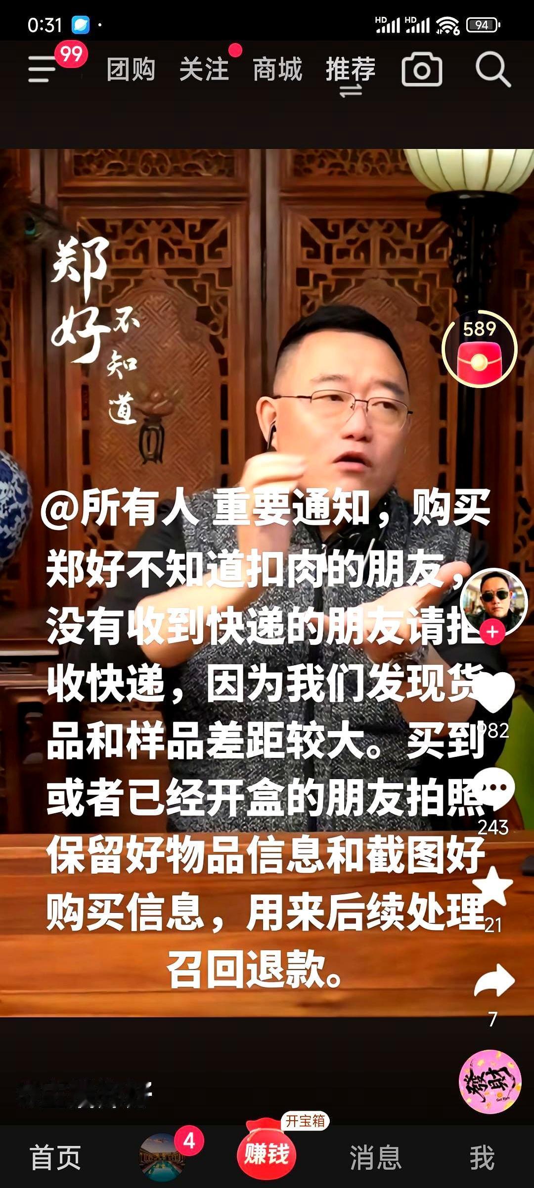 直播间礼物把差评刷没了 昨晚郑好卖99元牛肉干,到货薄得像纸。网友刷屏质问,突然一排火箭升空,特效盖满屏。他一句解释没有,只对着镜头抱拳笑。 我数了下,十秒蹦出47个嘉年华,价值1万4。刷礼的6437不是路人,是他家榜榜首,半年砸了30万。平台规则写得清:用户有权在公屏提问,主播不得用礼物遮挡。可规则没人管,火箭继续飞,质疑被压到最底。。 带货不是说相声,样品和实物对不上,就是欺诈。想靠铁粉砸钱洗地,洗得了一时,洗不了一辈子。今天敢用纸片牛肉糊弄,明天就敢用空气包。 别刷礼物,先退货。平台真该把弹幕置顶功能打开,让差评飞一会。