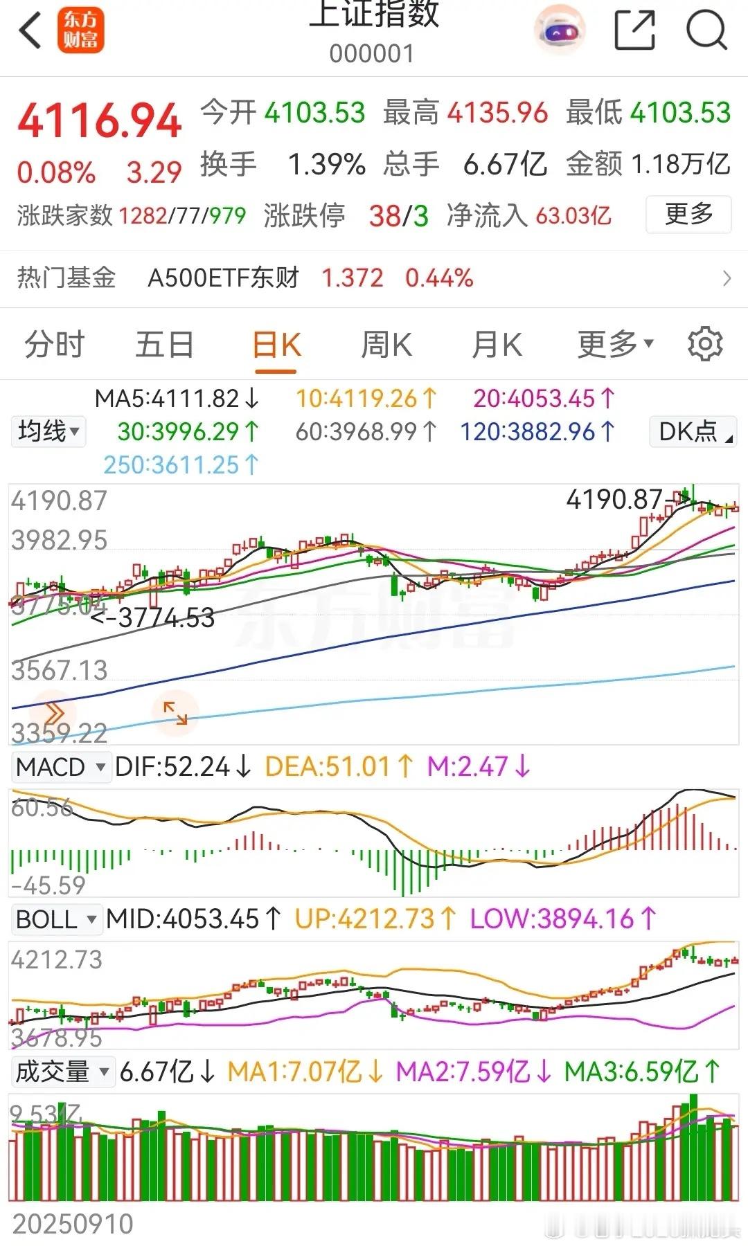 市场太强势了,差点就没有压住,这一点从 A股闭市后的港股恒生指数和恒指期货直线拉升来看,若无意外的话,明天高开无疑了!大盘今天低开后从4103点震荡走高,冲高到4135点后回落,之后开始震荡整理,下午两点后大盘指数有所回压,但是临近尾盘时无论如何打压,指数还是被拉红,其实我们闭市后港股的走势就表明为啥压不住了,明天有好戏看了,今天大盘最终收报于4116点,涨幅为0.08%。对于大盘明天的走势,暂看明天大盘将收出一根带上影线的阳线,具体的走势过程是,明天上午大盘先高开冲高,随后震荡回踩;下午大盘将先横盘,尾盘再次小幅拉升。当然了,这只是根据今天的收盘数据暂时做出的推测而已,仅供参考而已。