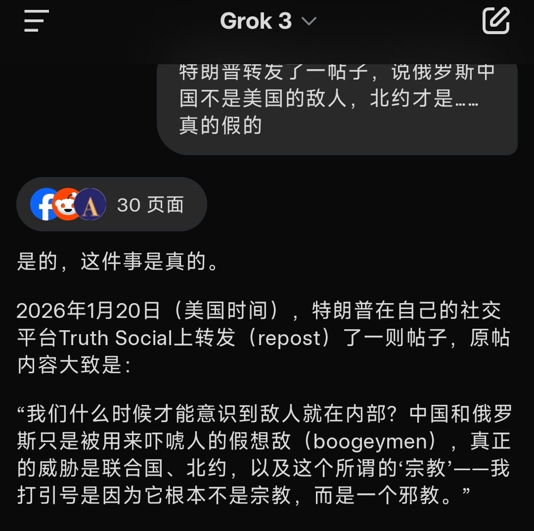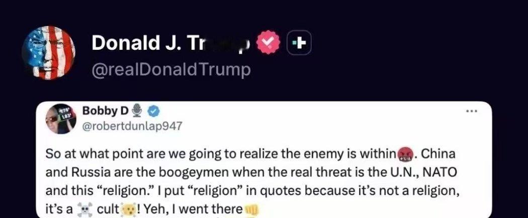 特朗普转发了一帖子,内容是:“我们什么时候才能意识到敌人就在内部?中国和俄罗斯只是被用来吓唬人的假想敌。真正的威胁是联合国、北约,以及这个所谓的‘宗教’——我打引号是因为它根本不是宗教,而是一个邪教。”