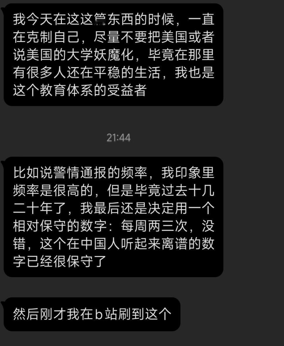 图1里,一位20年前在伯克利大学读书的网友回忆到:伯克利大学校园或者周边发生抢劫、杀人、强奸等恶性案件之后,学校就会给学生发警报短信。他读大学那会,每周会发两三次。最近他发现,发警报短信的频率已经变成了每天至少一次了。意味着,美国顶级的学府伯克利大学周边,每天至少一起抢劫、杀人、强奸之类的恶性案件。这事在中国网友听起来简直天方夜谭。他毕业之后混的风生水起,是美国教育体系的受益者,所以在谈起美国的大学教育体系时也尽量克制,避免妖魔化,可即便这样,也肉眼可见美国在走下坡路。…………………虽然我对美国的治安状况有一些了解,但顶级学府周围这么多恶性案件还是远远超出了我想象。