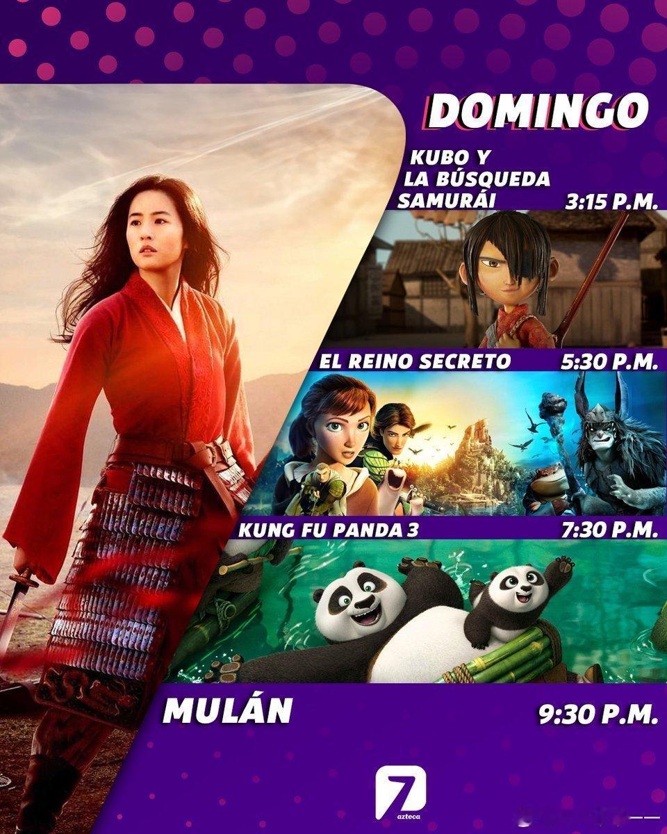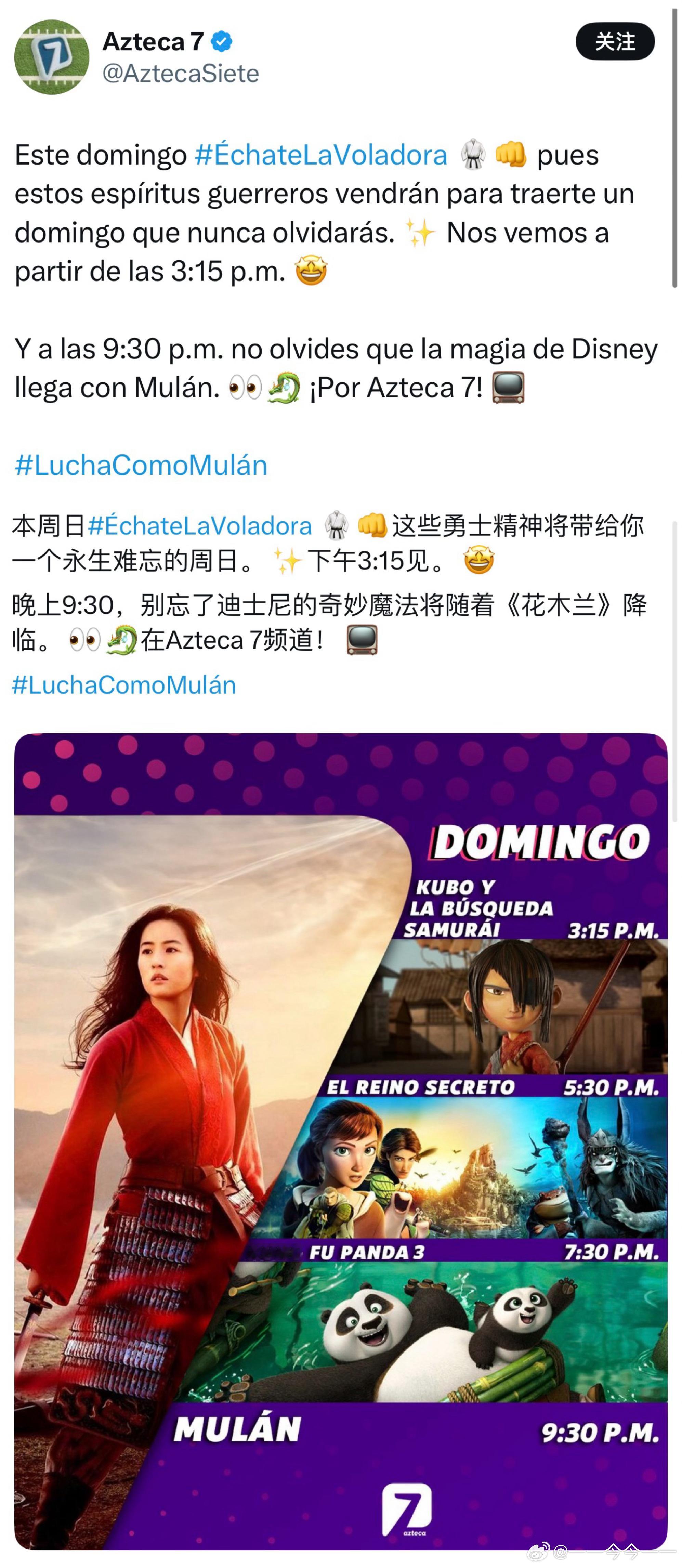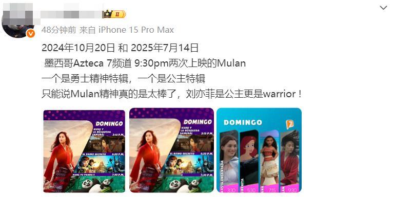 墨西哥Azteca 7频道两次上映了刘亦菲主演的电影《MULAN》。一次跟《功夫熊猫》、《魔弦传说》、《秘密王国》放在勇士精神特辑。一次跟安妮海瑟薇的《魔法灰姑娘》、动画版的《海洋奇缘》和《美人鱼》放在公主特辑。亦公主亦女王亦战士,世界流行文化Icon,全球影史经典人物~