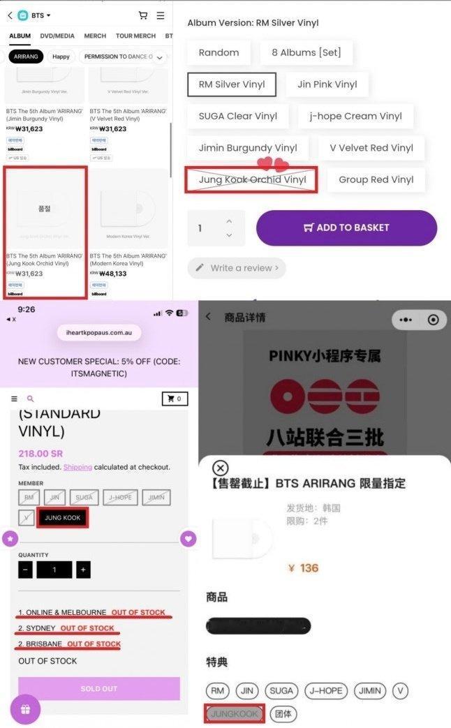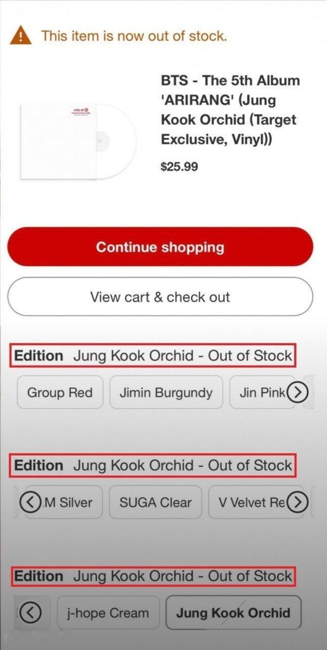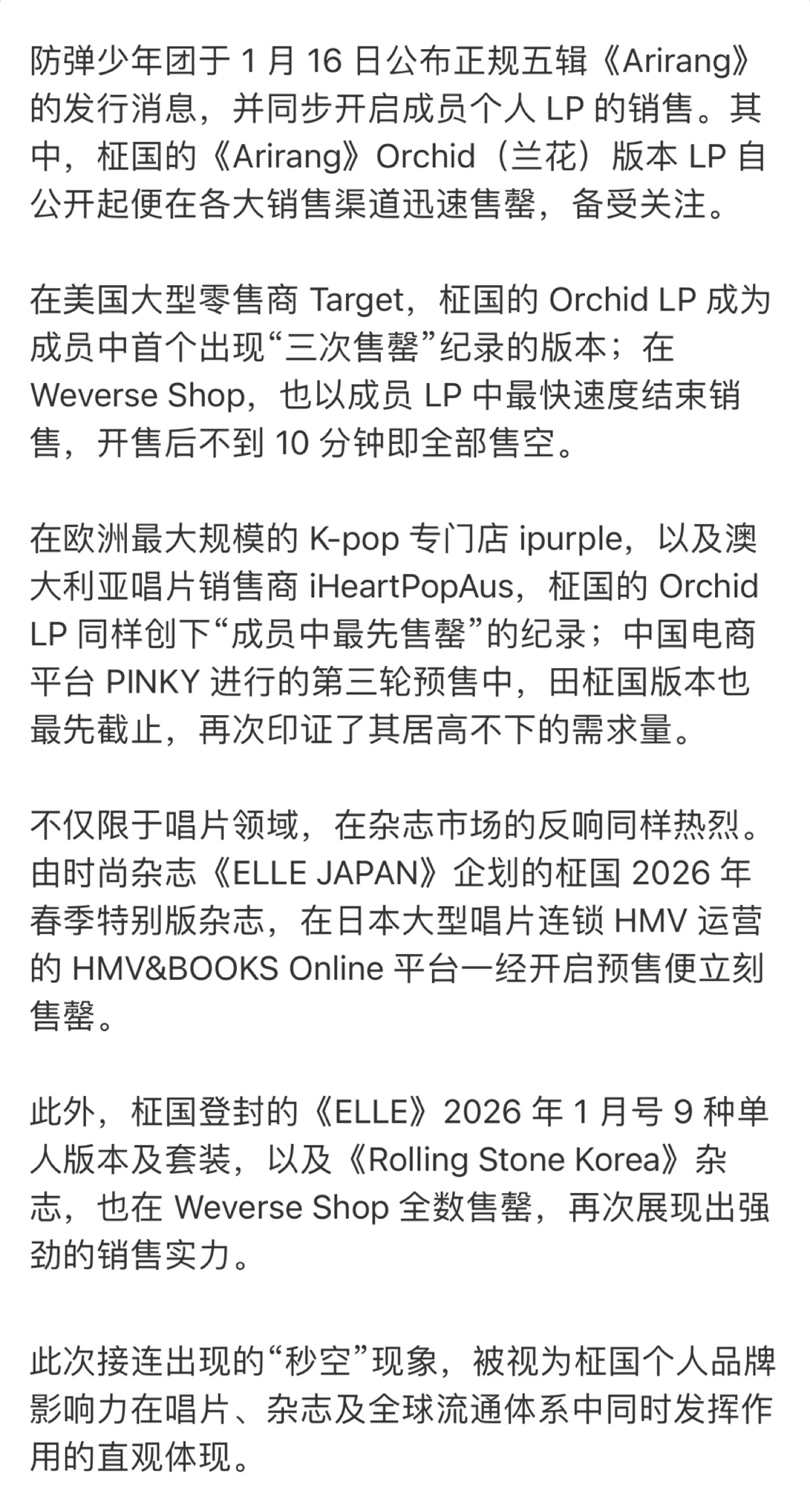 田柾国黑胶唱片三次售罄 据韩媒,田柾国的《阿里郎》兰花版黑胶唱片人气爆棚,成为首位在美国大型零售商Target三次售罄的成员,Weverse Shop也是成员 LP黑胶中最快速度售罄。